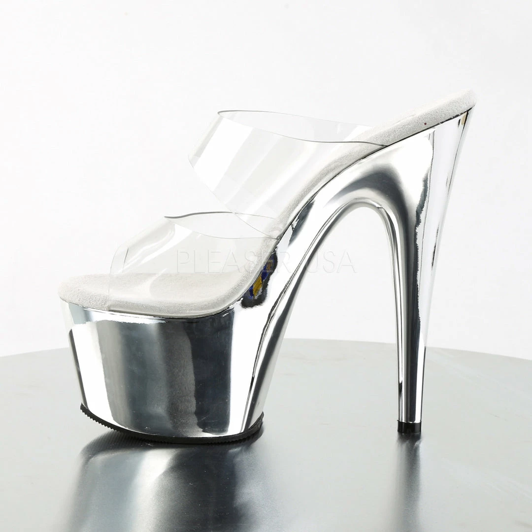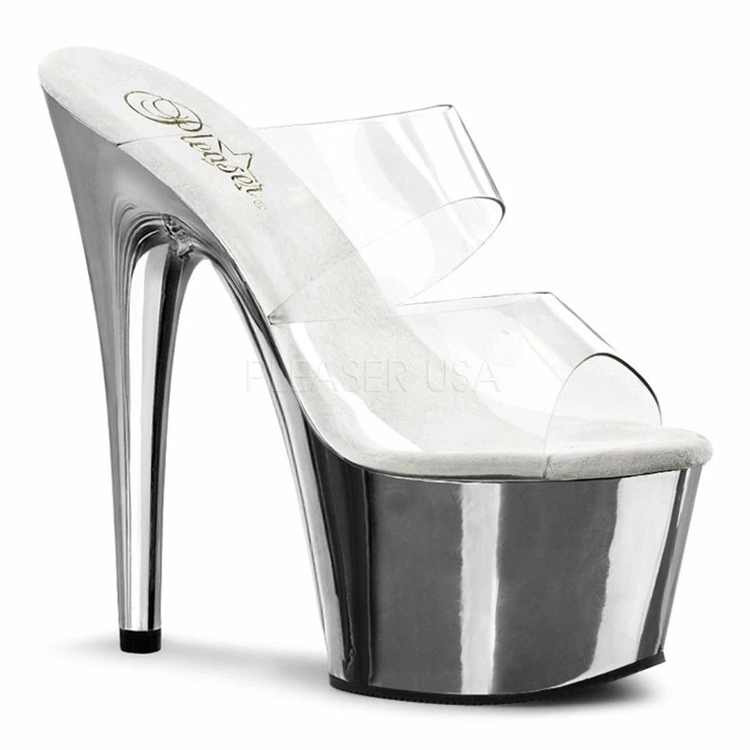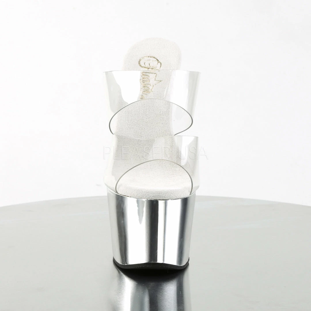 7″ (17.8cm) Stiletto heel, chrome plated platform slide featuring two-band clear straps.