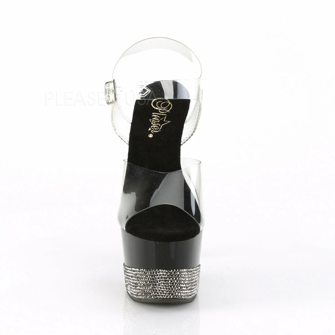 7″ (17.8cm) Stiletto heel, 2 3/4″ (7cm) platform ankle strap sandal featuring rhinestone encrusted platform.