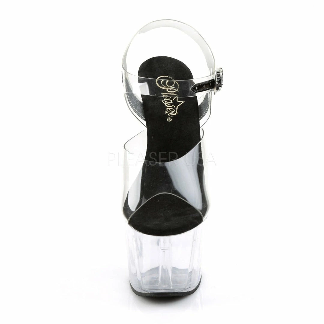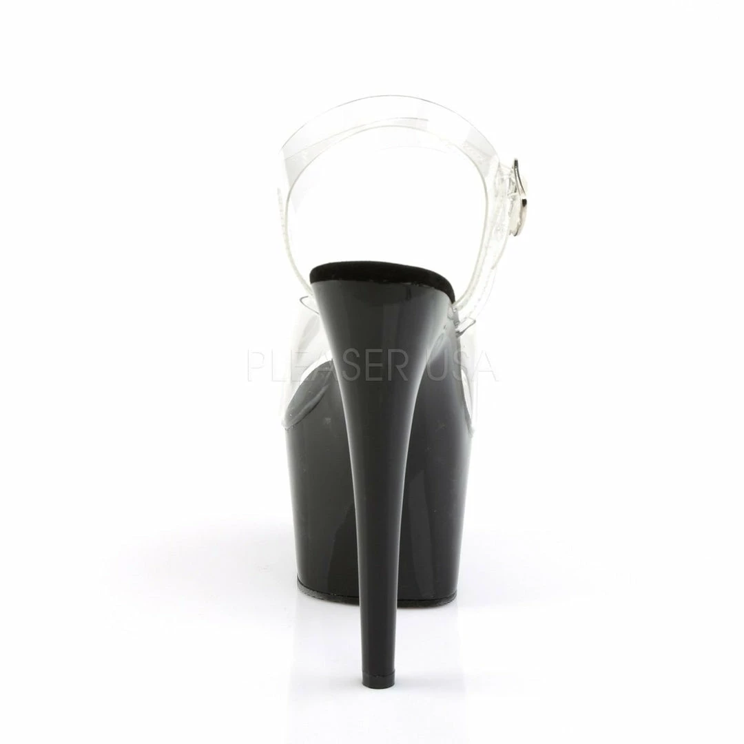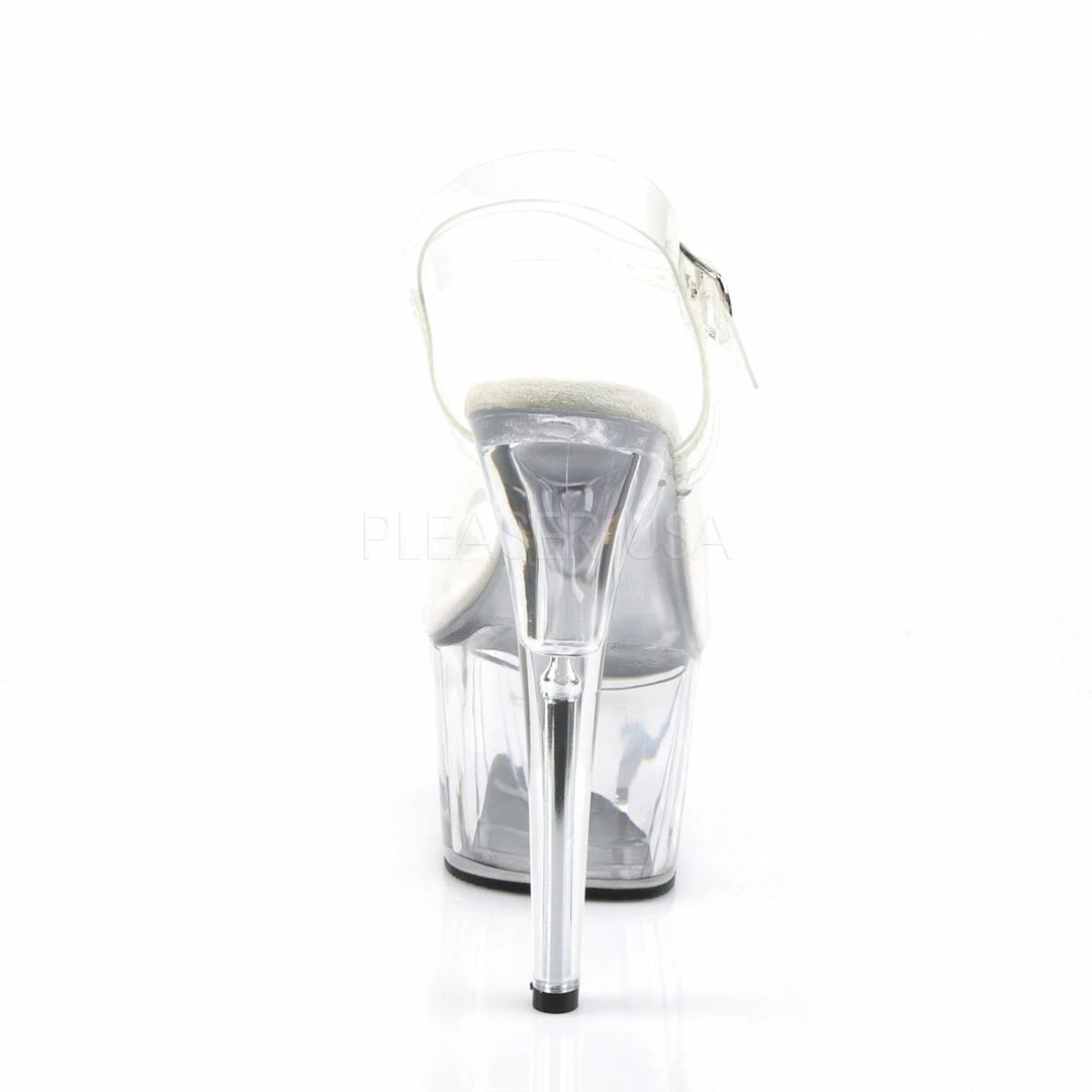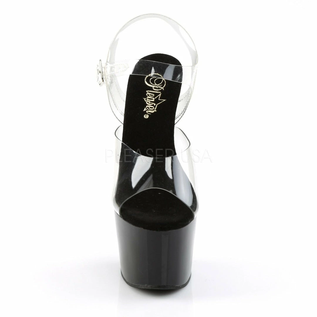 7″ (17.8cm) Stiletto heel, 2 3/4″ (7cm) platform ankle strap sandal.