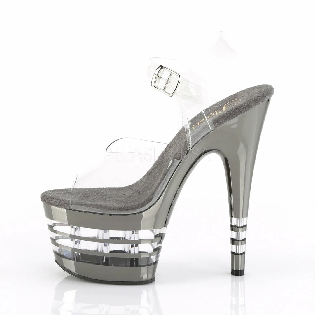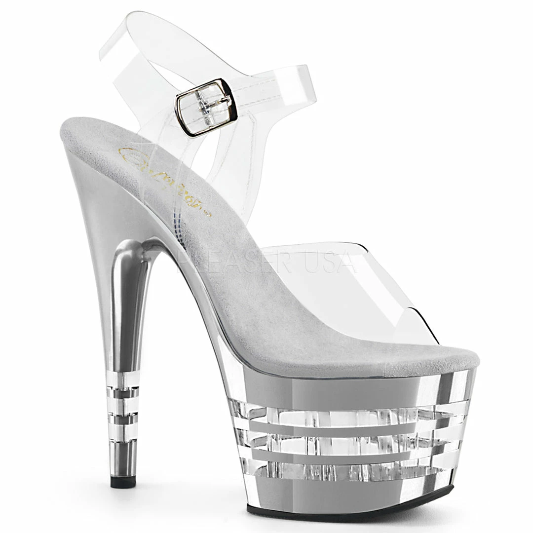 7″ (17.8cm) Stiletto heel, 2 3/4″ (7cm) chrome plated lined platform ankle strap sandal.