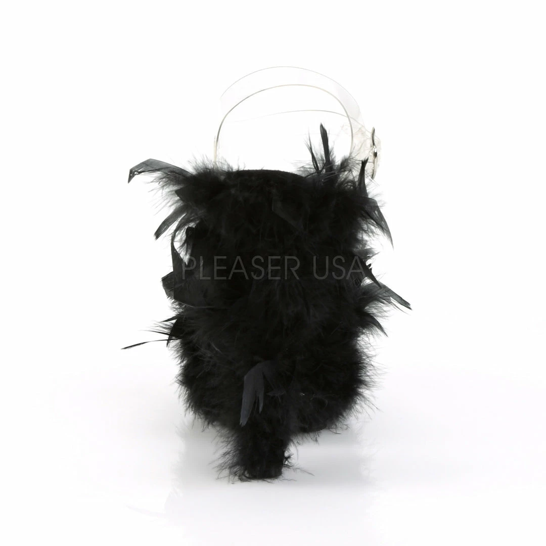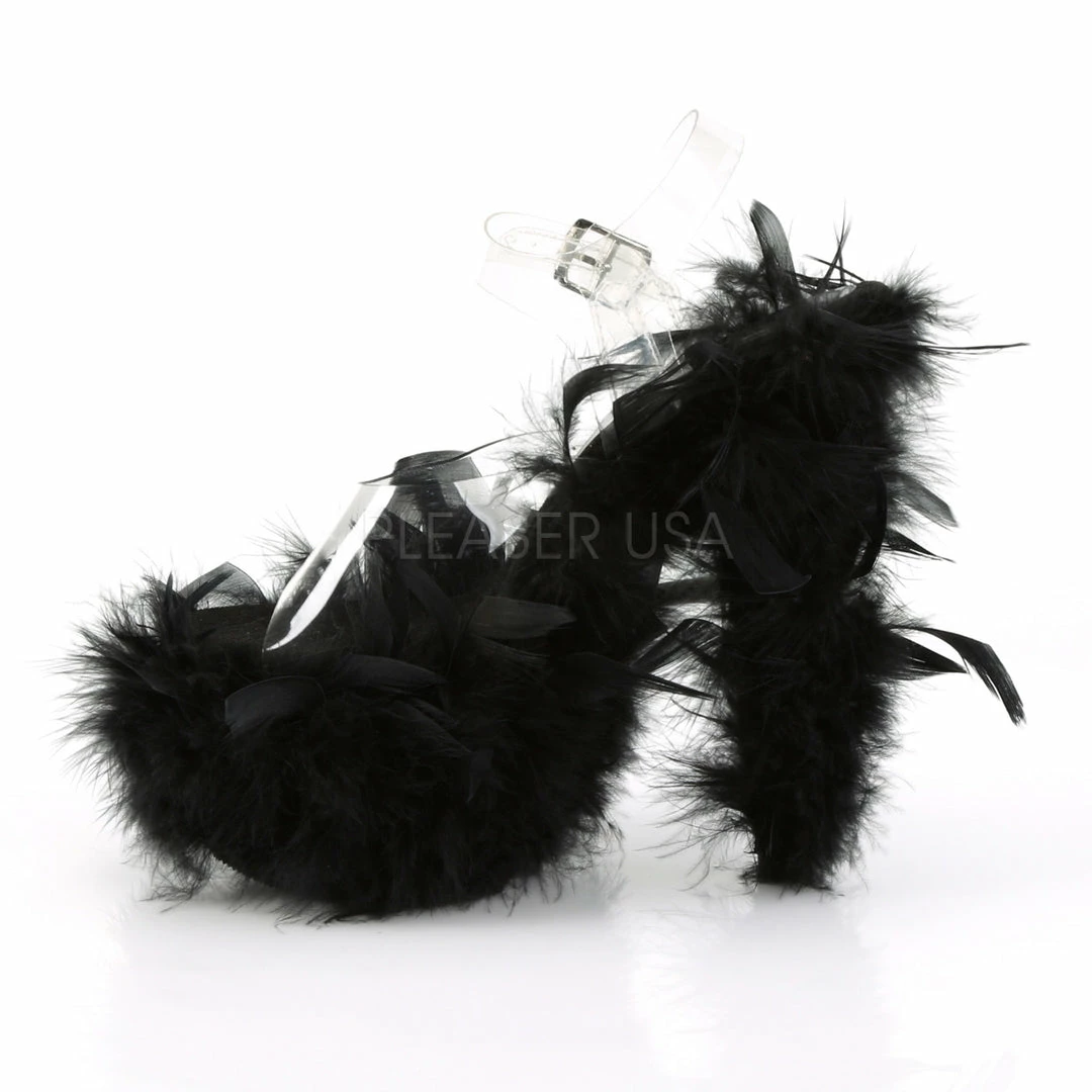 7″ (17.8cm) Stiletto heel, 2 3/4″ (7cm) platform ankle strap sandal with marabou feather covering the entire platform bottom.