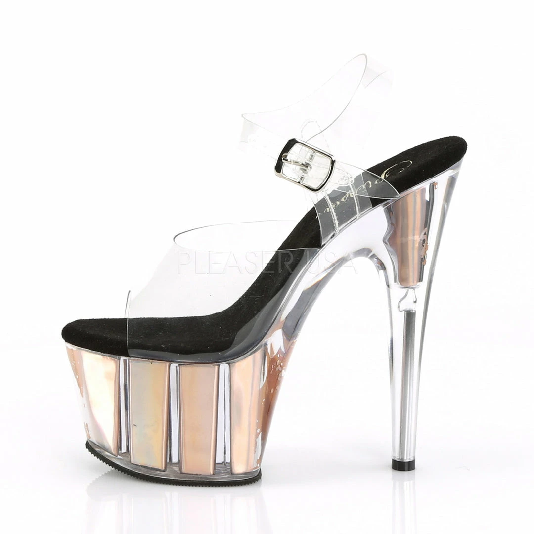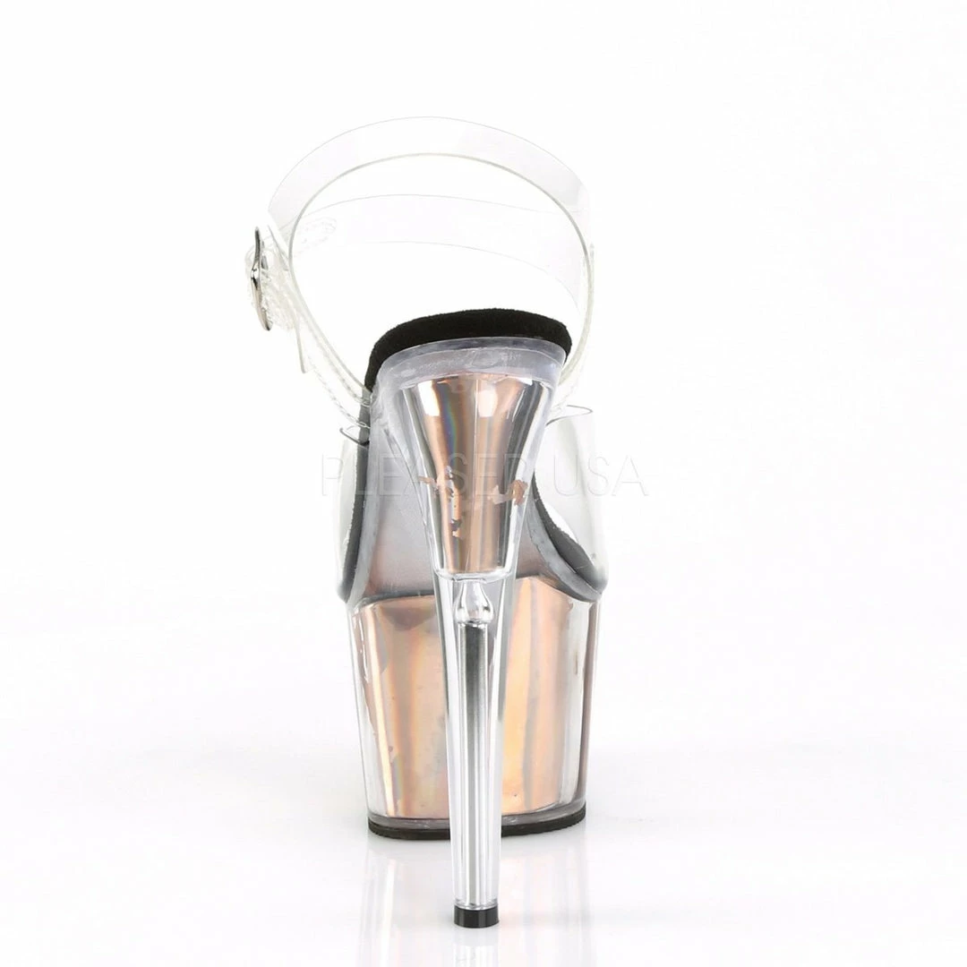 7″ (17.8cm) Stiletto heel, 2 3/4″ (7cm) platform ankle strap sandal featuring holographic inserts in the platform bottom.