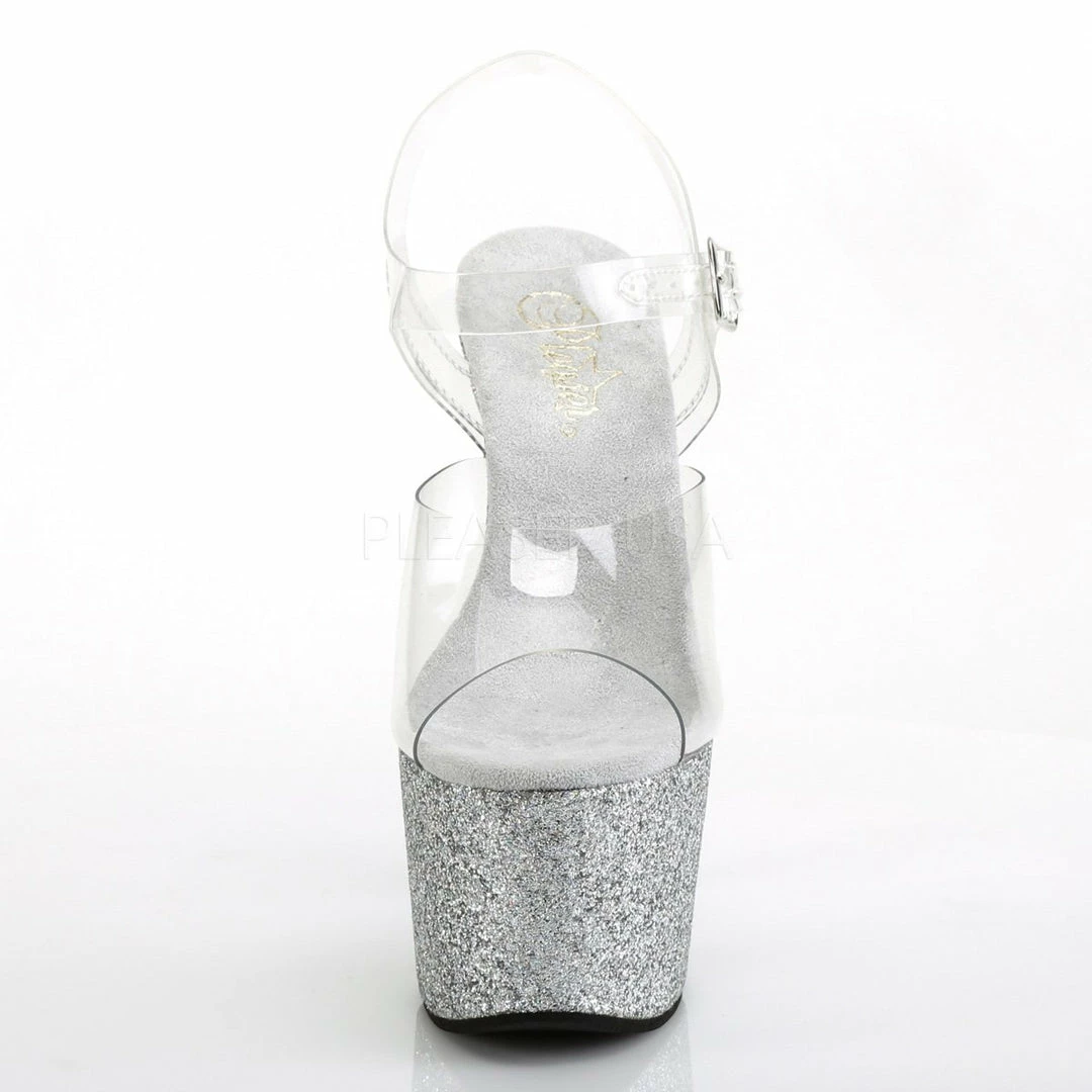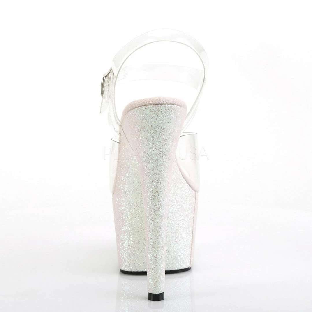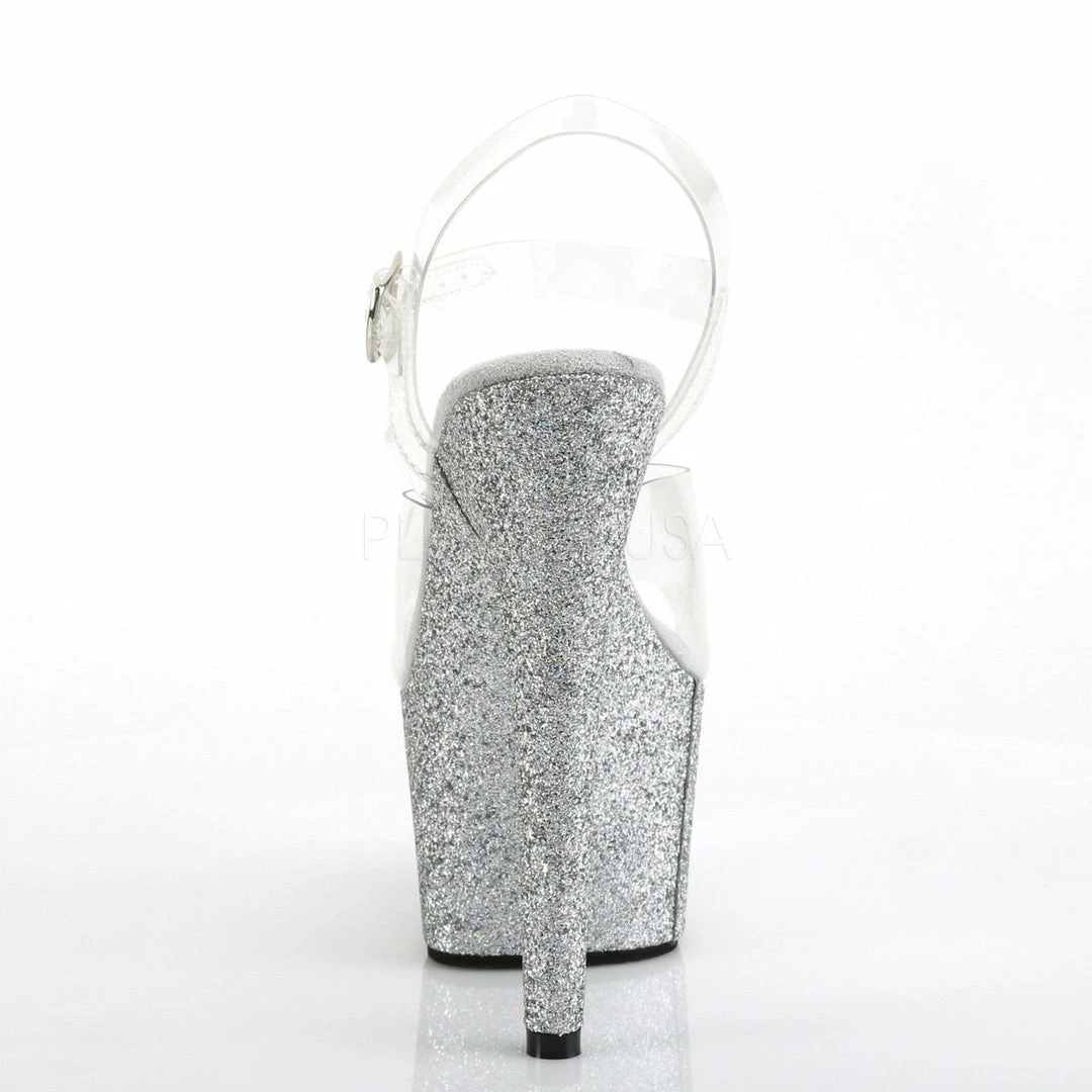 7″ (17.8cm) Stiletto heel, 2 3/4″ (7cm) platform ankle strap sandal featuring holographic mini glitter wrapped platform bottom.