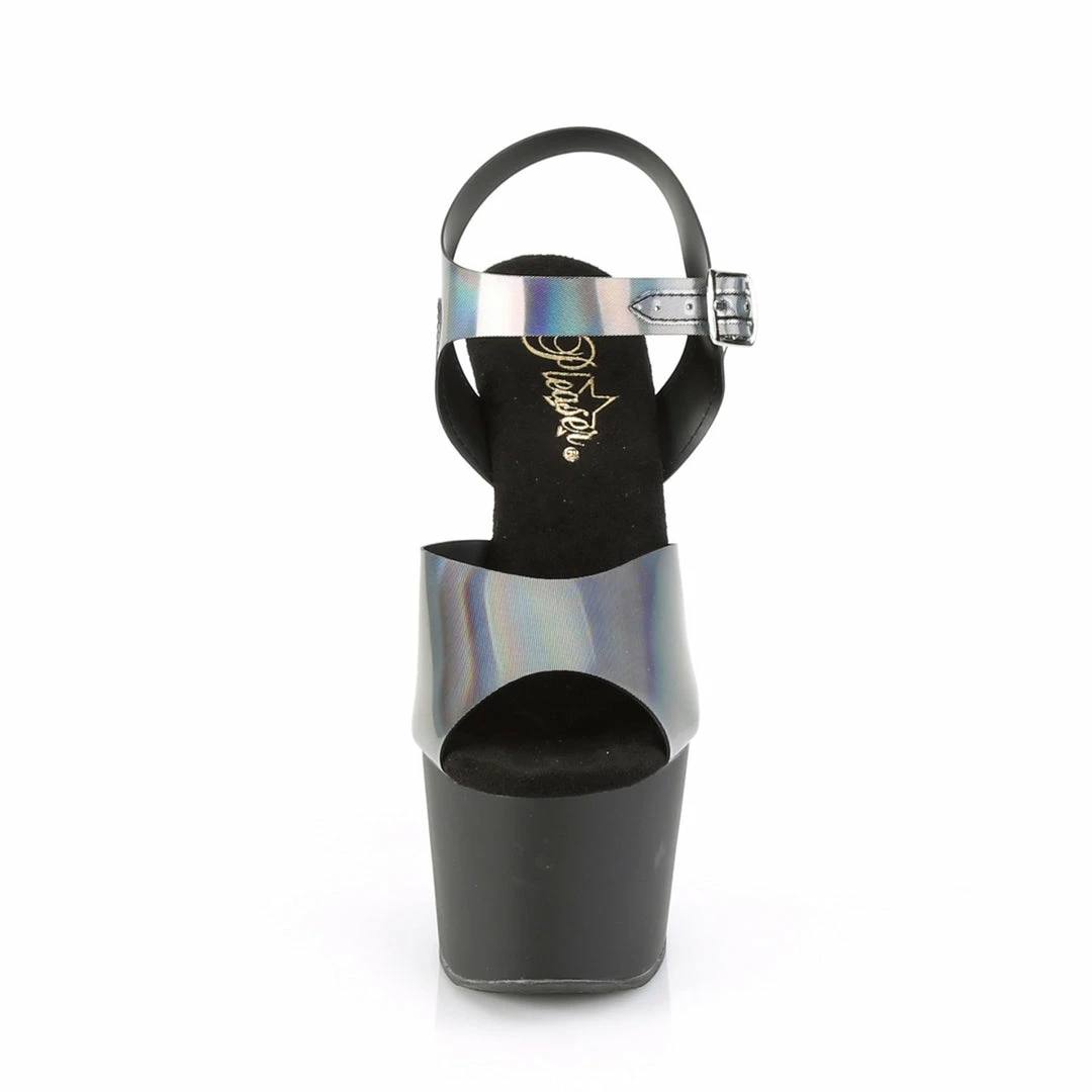 7″ (17.8cm) heel, 2 3/4″ (7cm) platform ankle strap sandal.