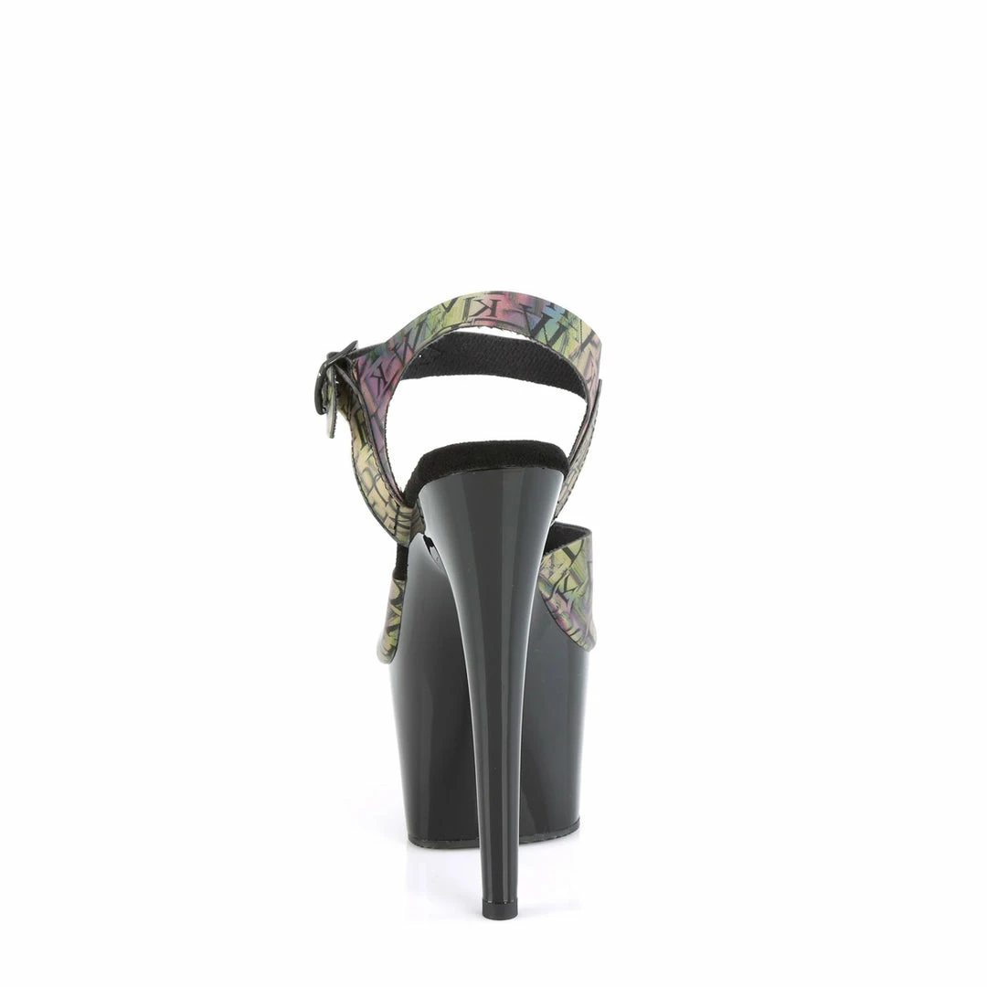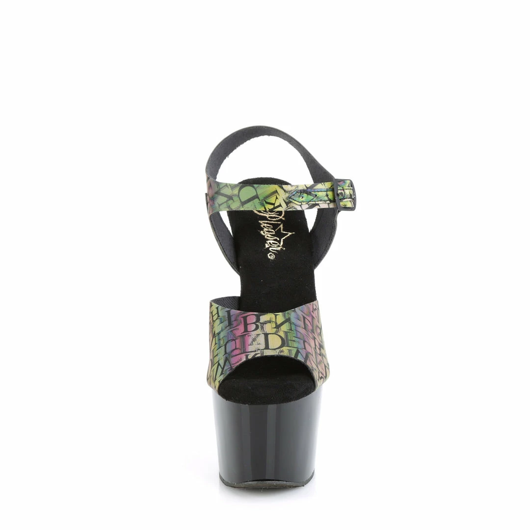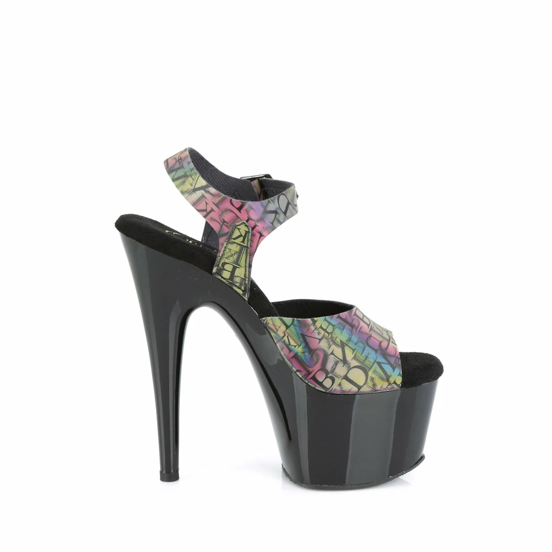 7″ (17.8cm) heel, 2 3/4″ (7cm)Β platform ankle strap sandal featuring holographic random letters print on upper.