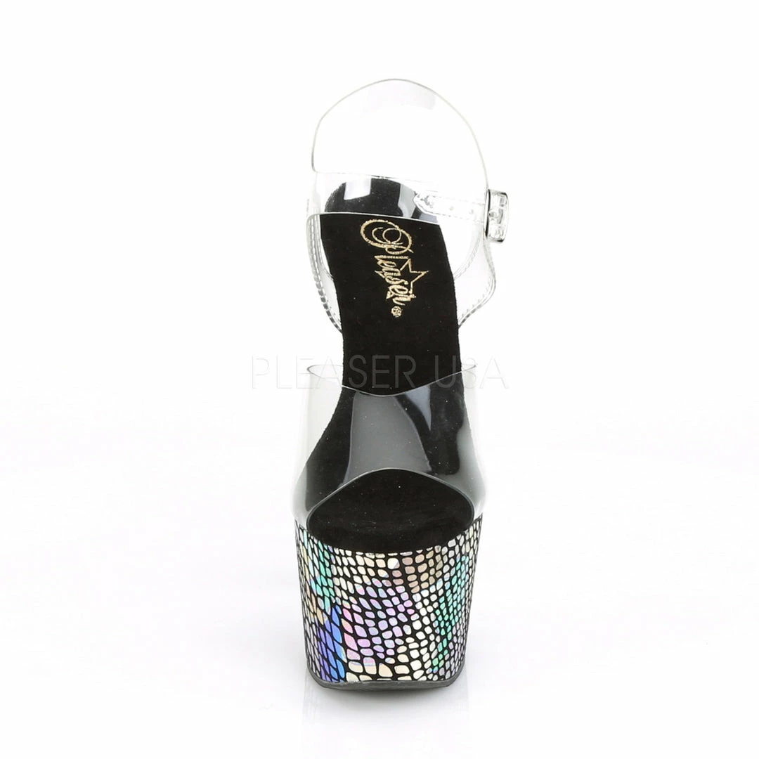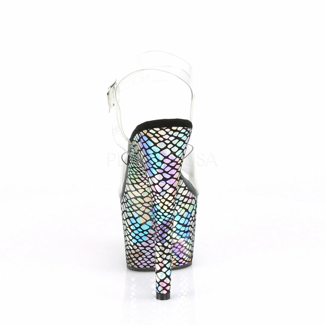 7″ (17.8cm) Stiletto heel, 2 3/4″ (7cm) platform ankle strap sandal featuring snake skin print wrapped platform bottom.