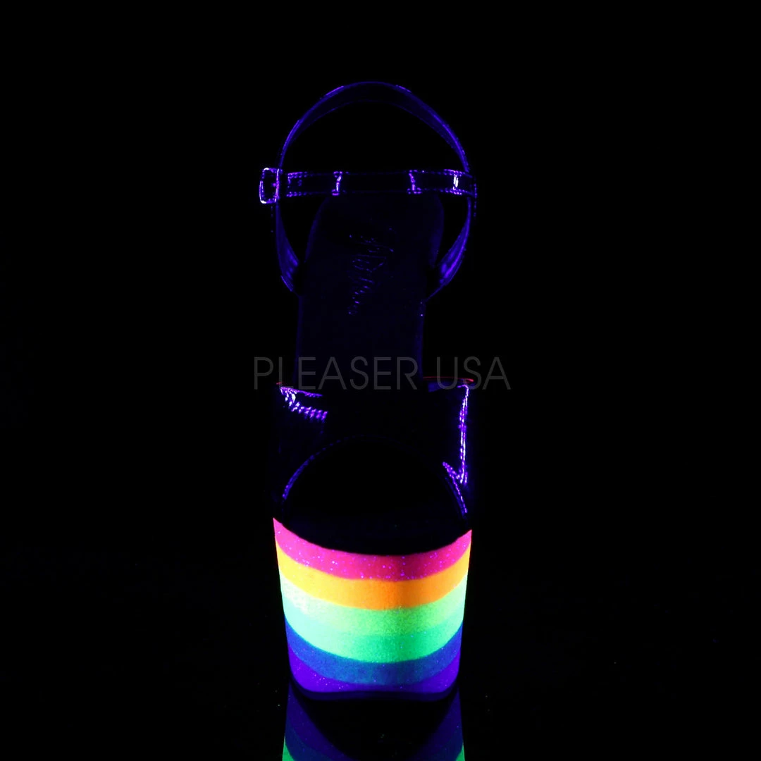 7″ (17.8cm) heel, 2 3/4″ (7cm) platform ankle strap sandal featuring neon UV reactive rainbow colored platform bottom.