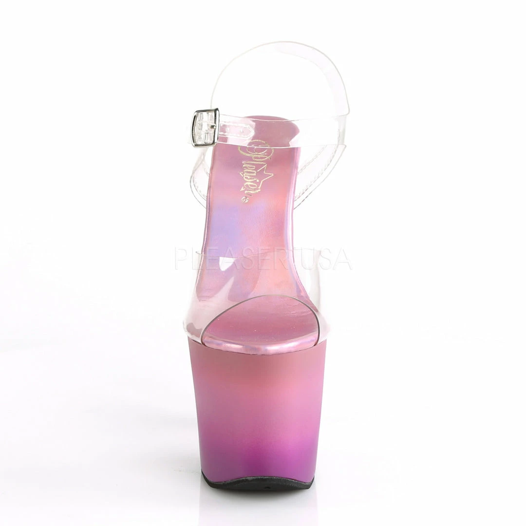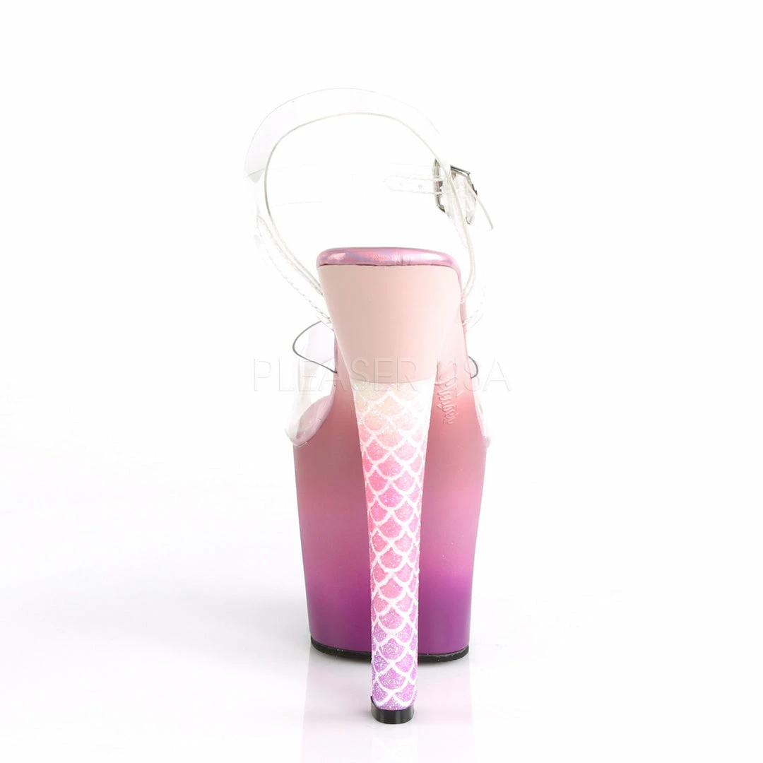 7″ (17.8cm) heel, 3 1/4″ (8.3cm) Platform ankle strap sandal featuring ombre platform and holographic ombre glitter mermaid scale heel.