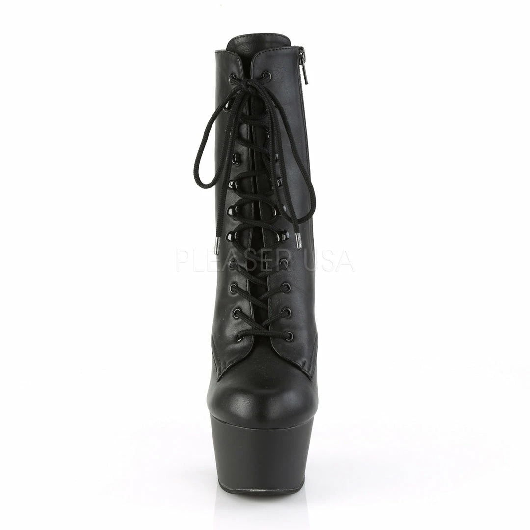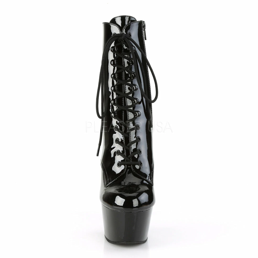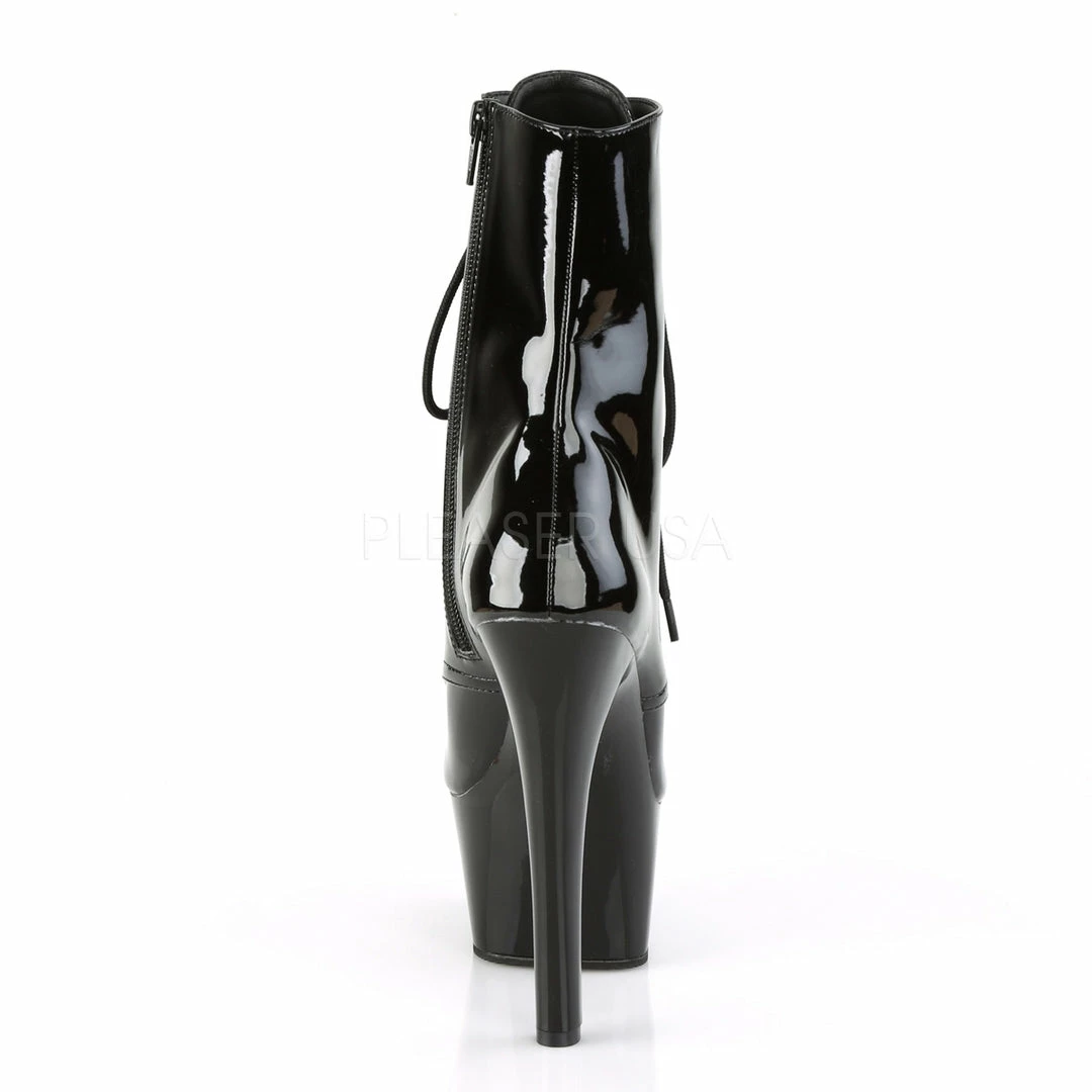 6″ (15.2cm)Β stiletto heel, 2 1/4″ (5.7cm)Β platform lace-up ankle boot with full inside zipper.