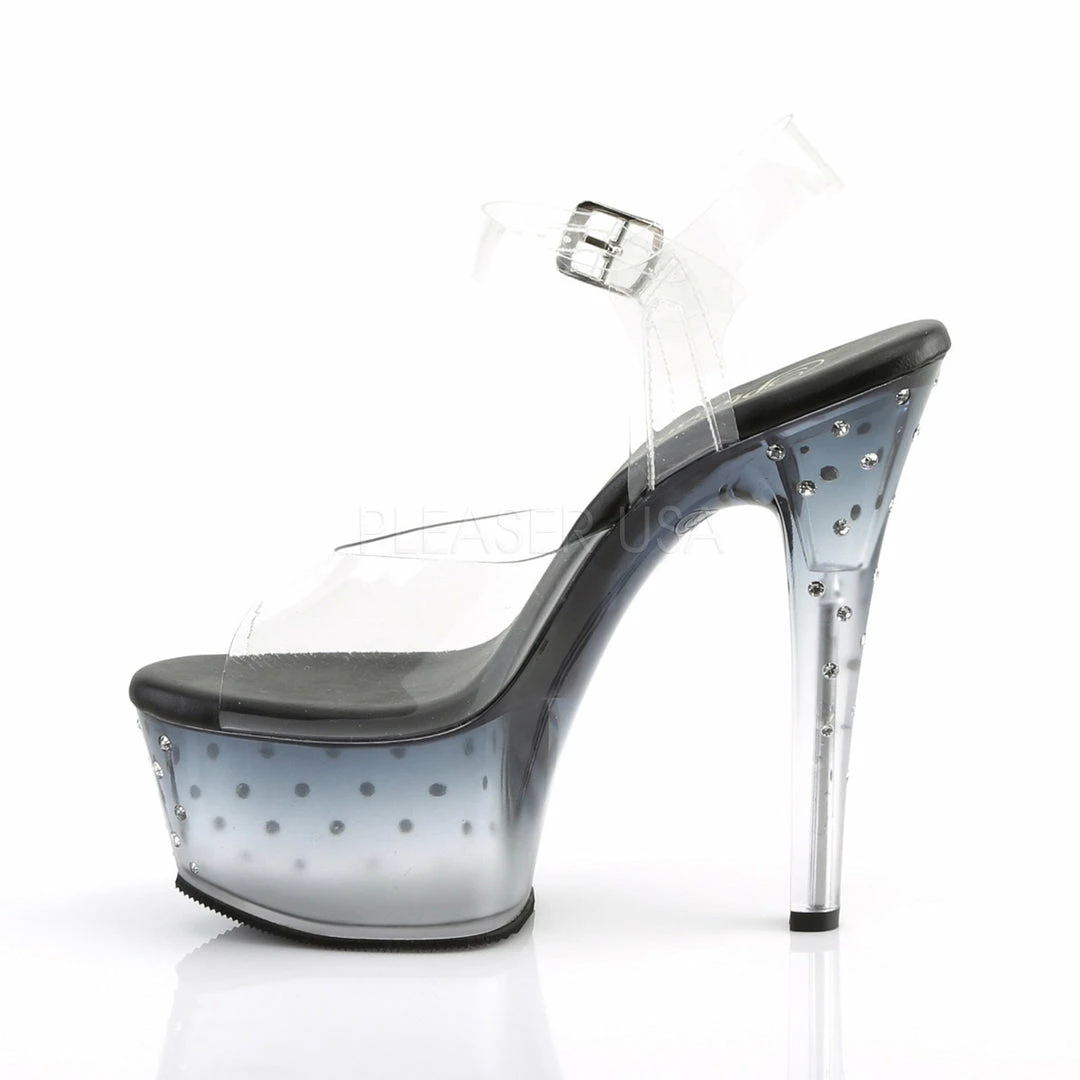 6″ (15.2cm) heel, 2 1/4″ (5.7cm) platform ankle strap sandal featuring multi-size rhinestones studded on the heel and outer side of the platform bottom.