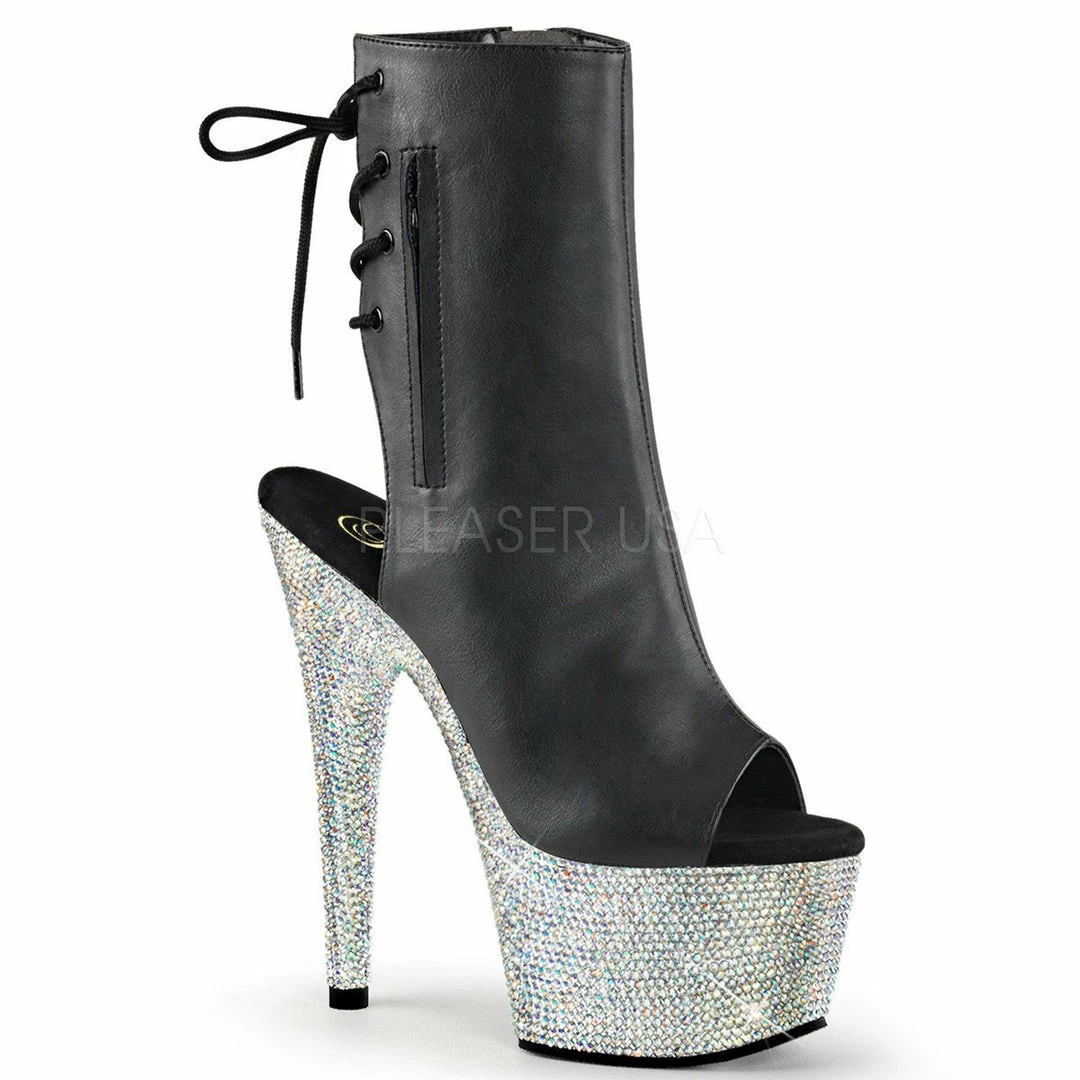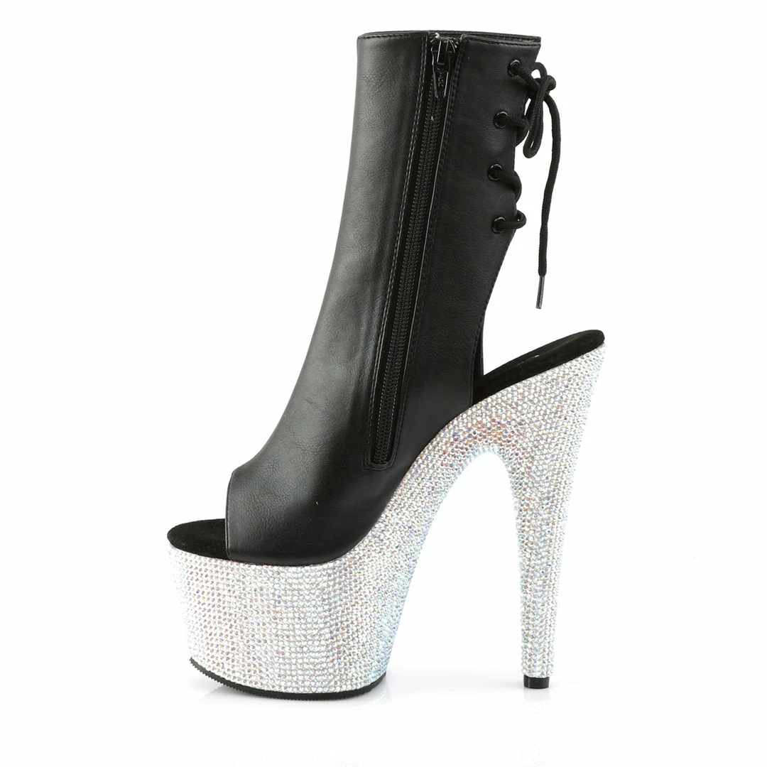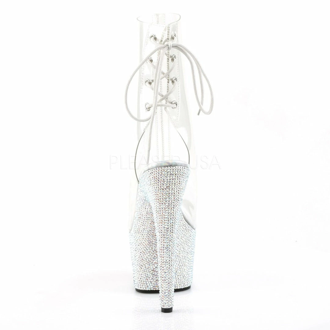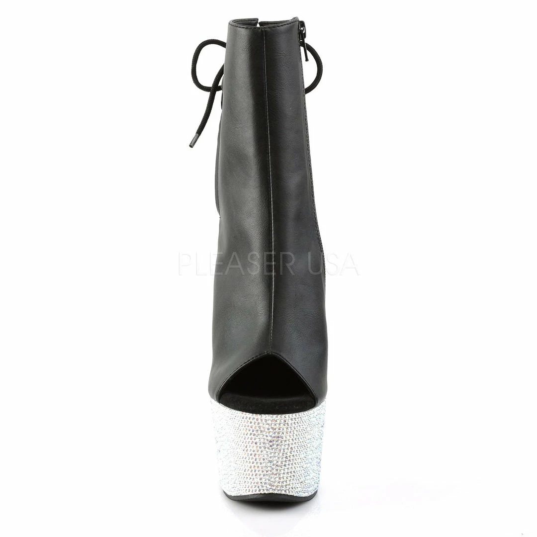 7″ PF open toe/heel, back lace-up ankle boot with hidden zip pocket featuring rhinestone encrusted platform bottom. Inside zip closure.