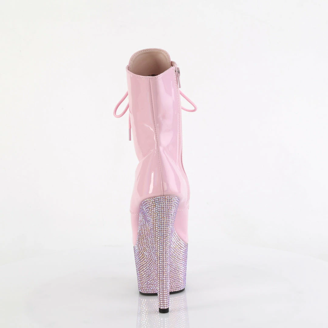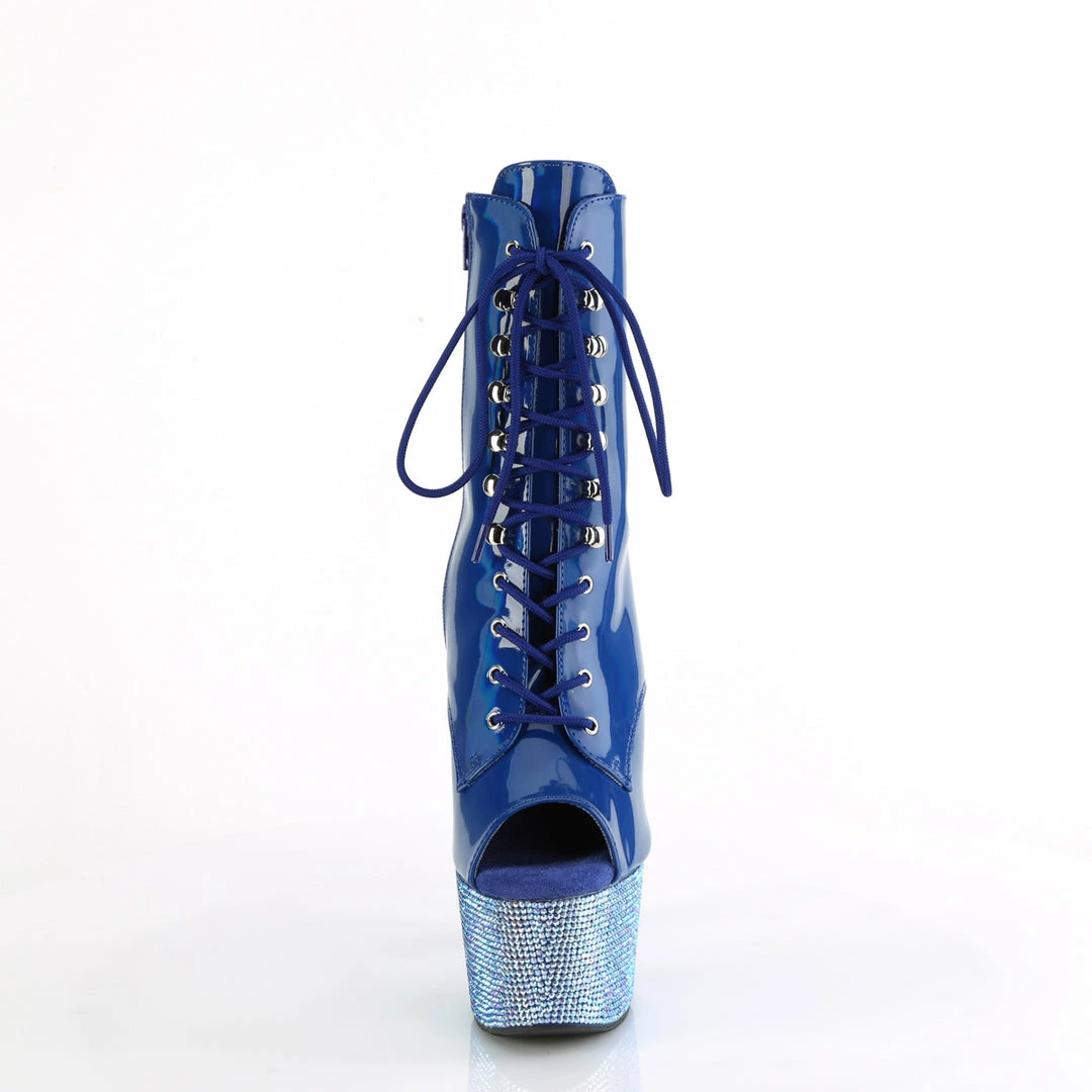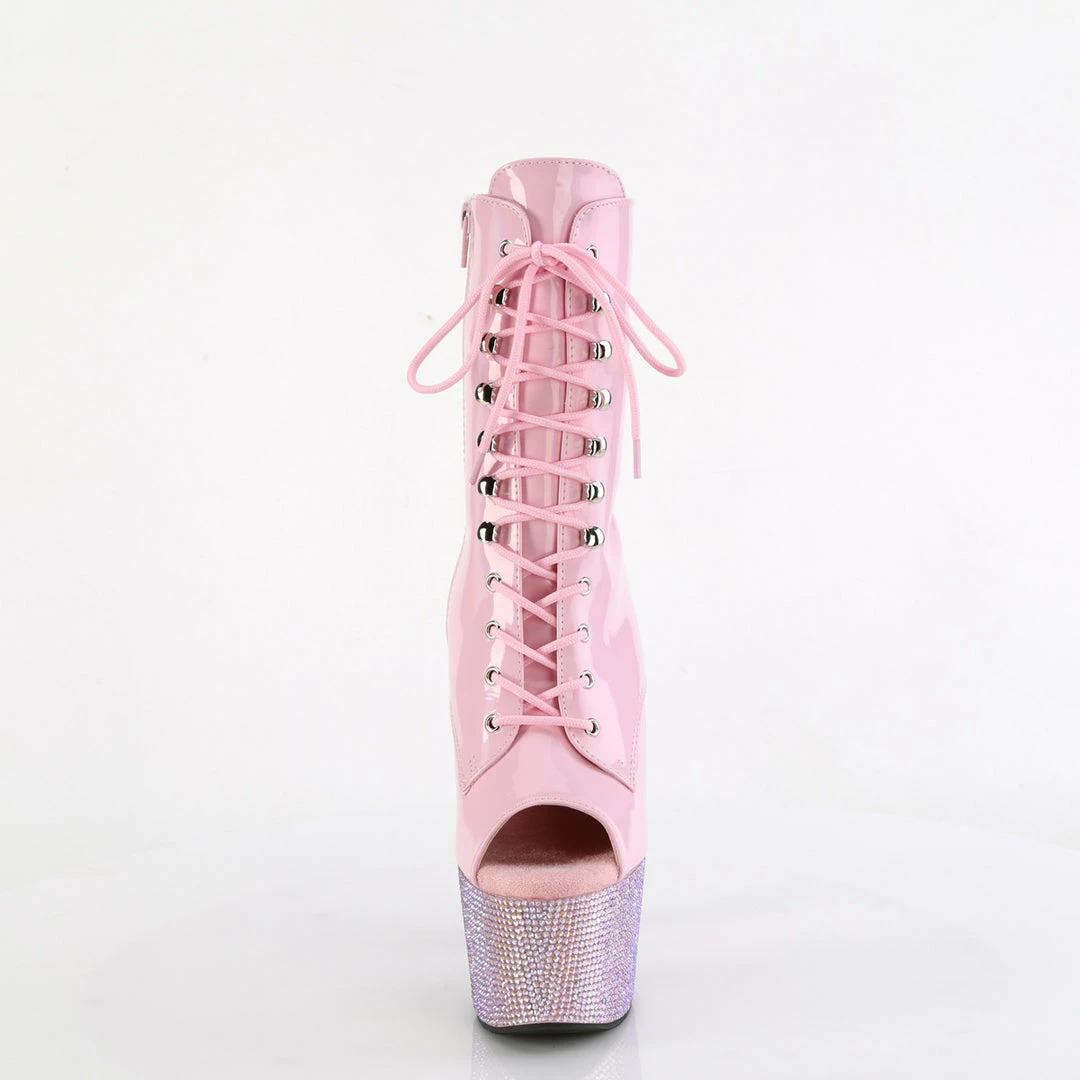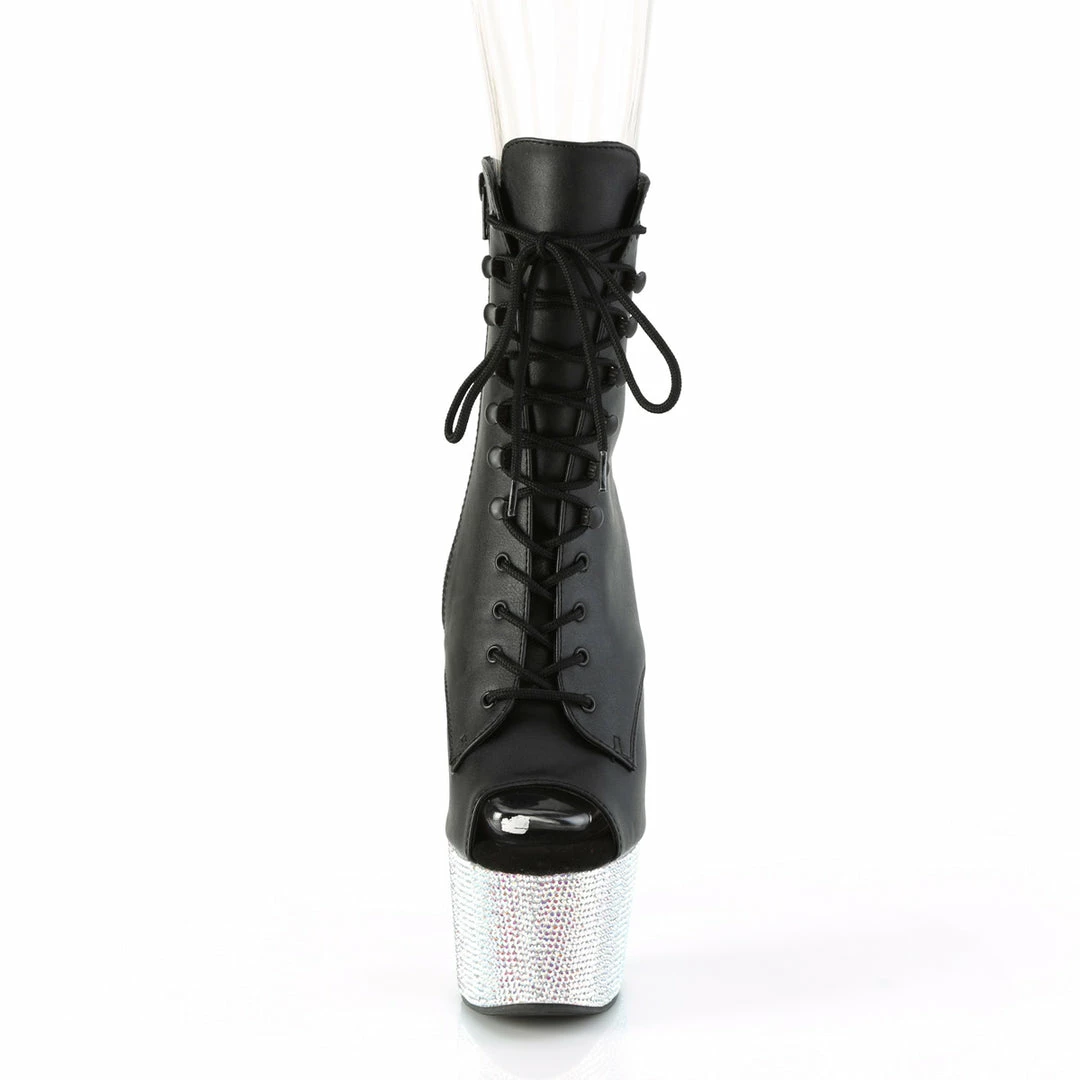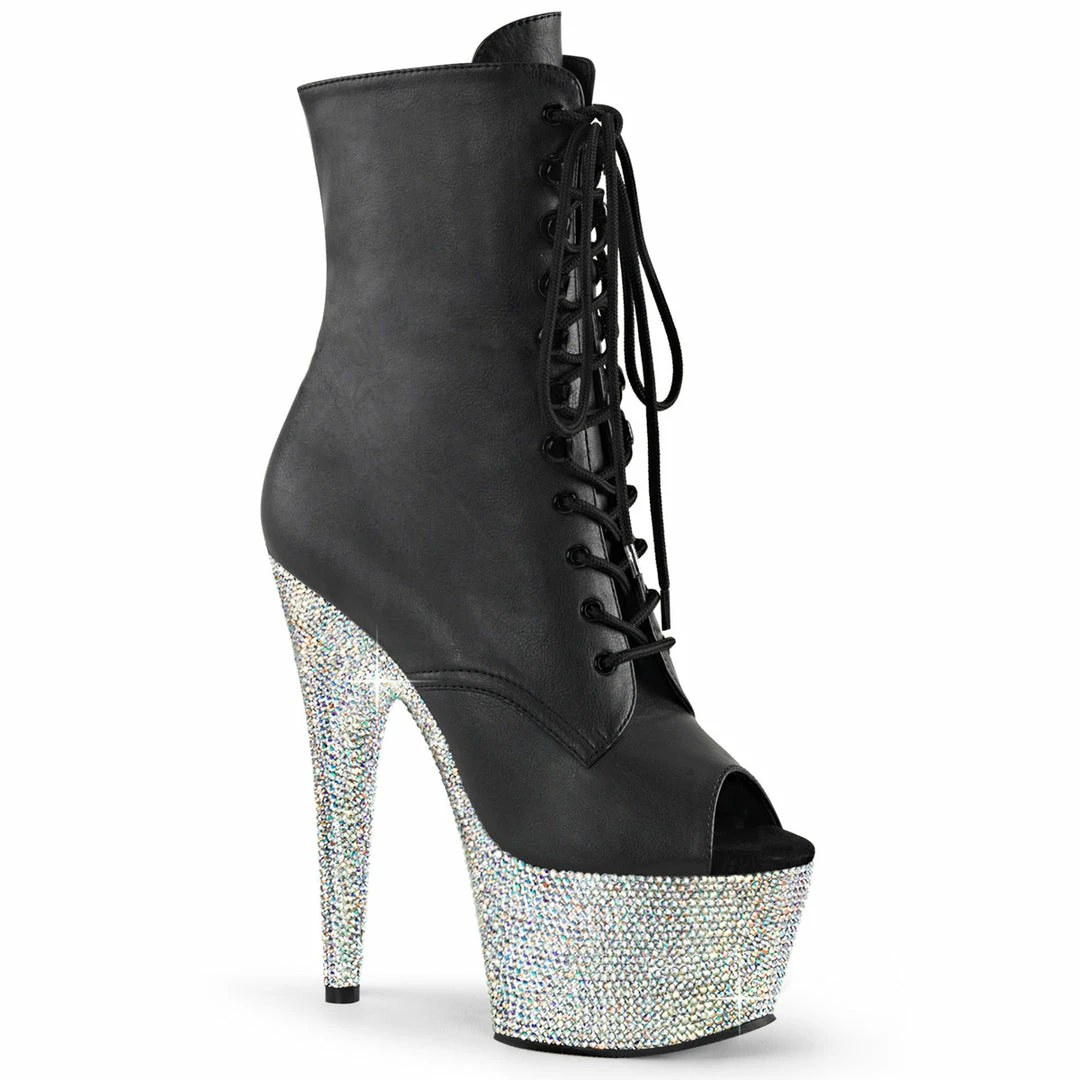 7″ (17.8cm) heel, 2 3/4″ (7cm) platform open toe front lace-up ankle boot featuring rhinestones encrusted all over the entire platform bottom. Inside zip closure.