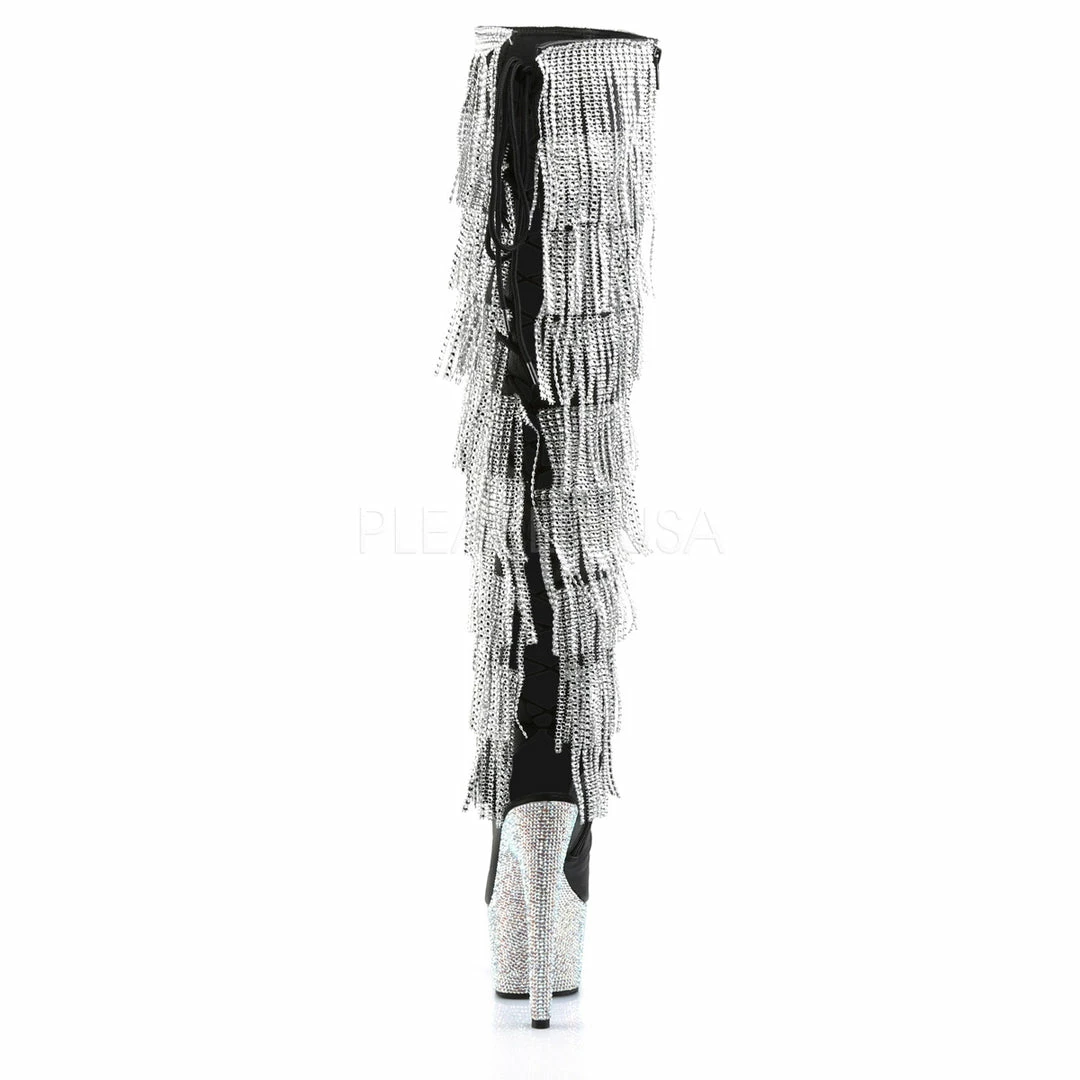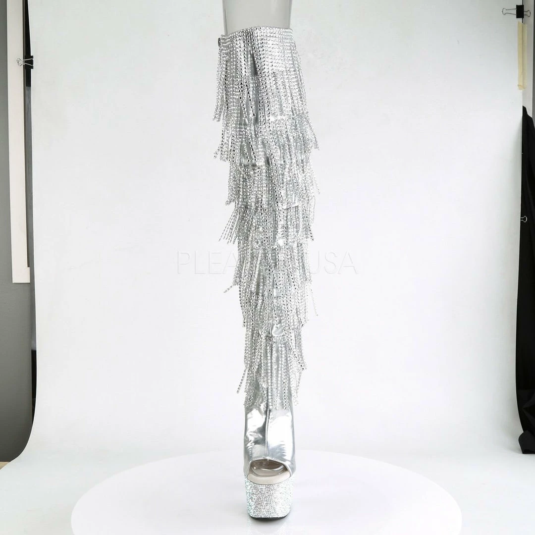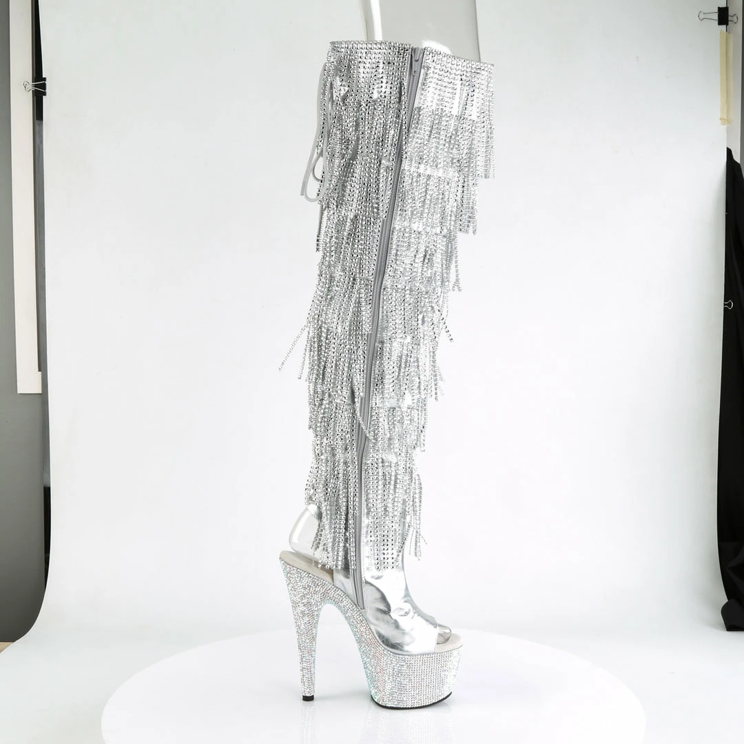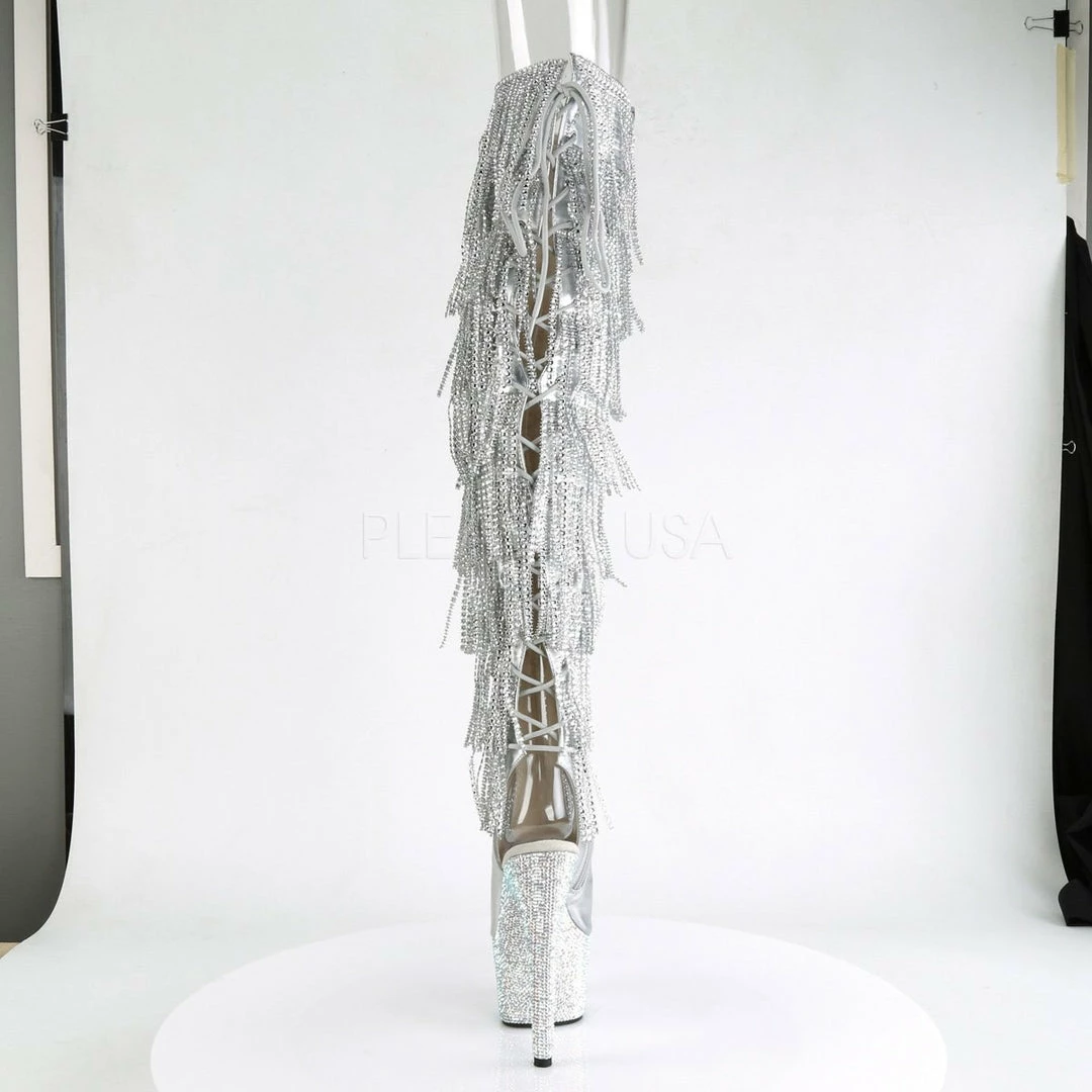 7″ (17.8cm) heel, 2 3/4″ (7cm) platform open toe/heel, lace-up back thigh high boot featuring 8-layer chrome plated, simulated rhinestone fringe and rhinestones covering entire platform bottom, inside zip closure.