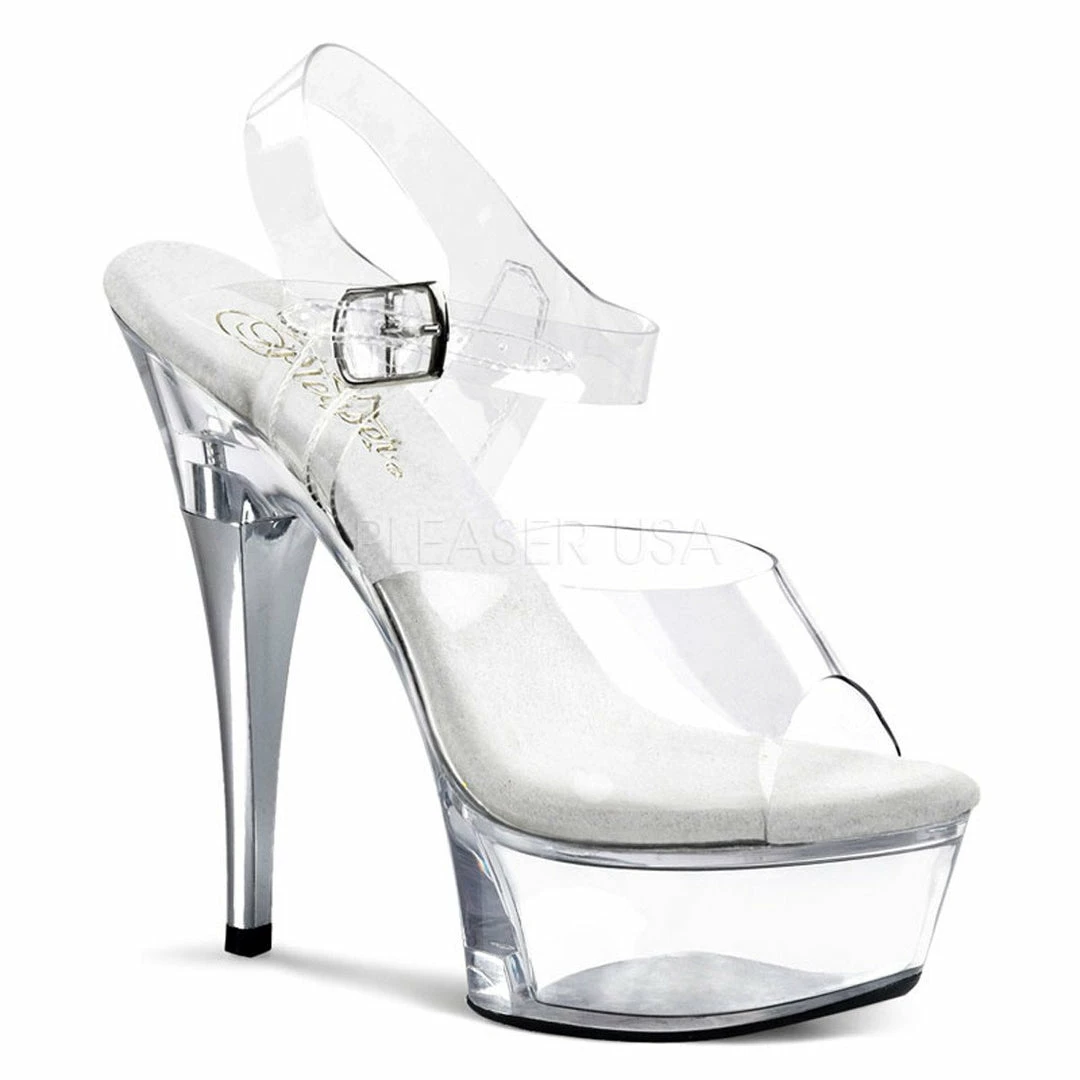 6″ (15.2cm) heel, (4.4cm) platform ankle strap sandal with rhinestones on back of heel.