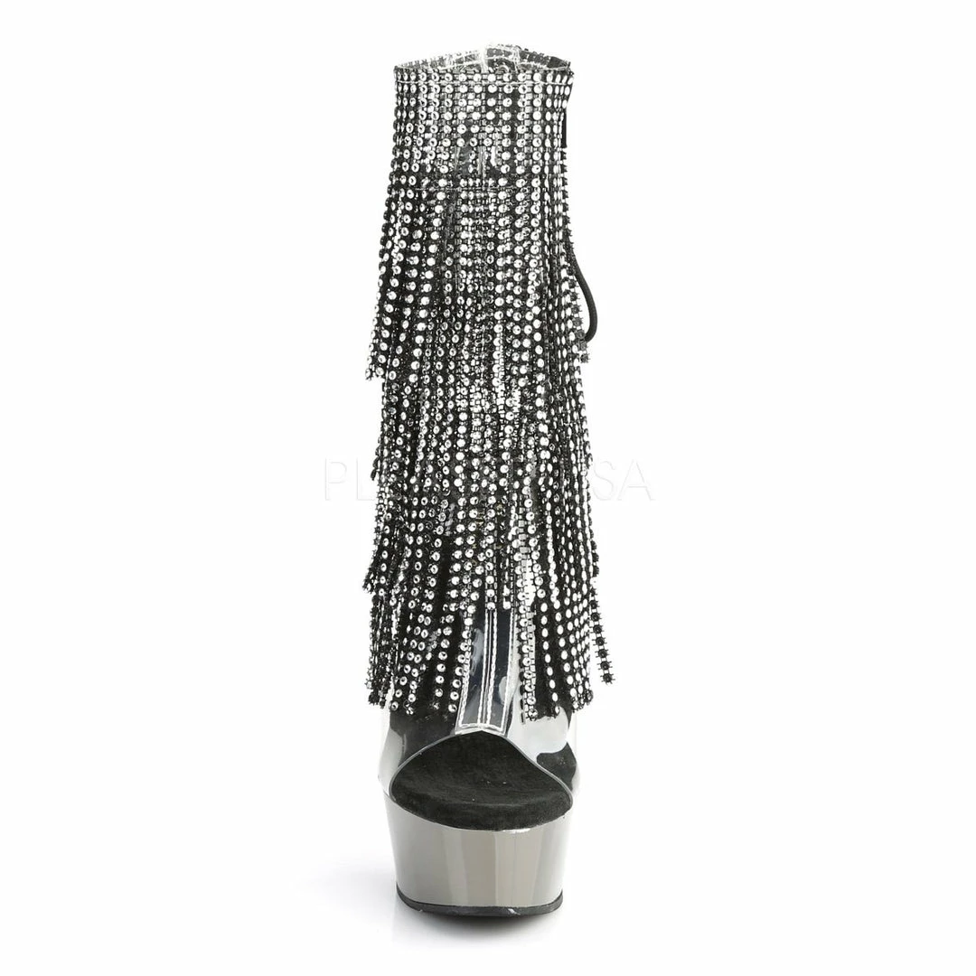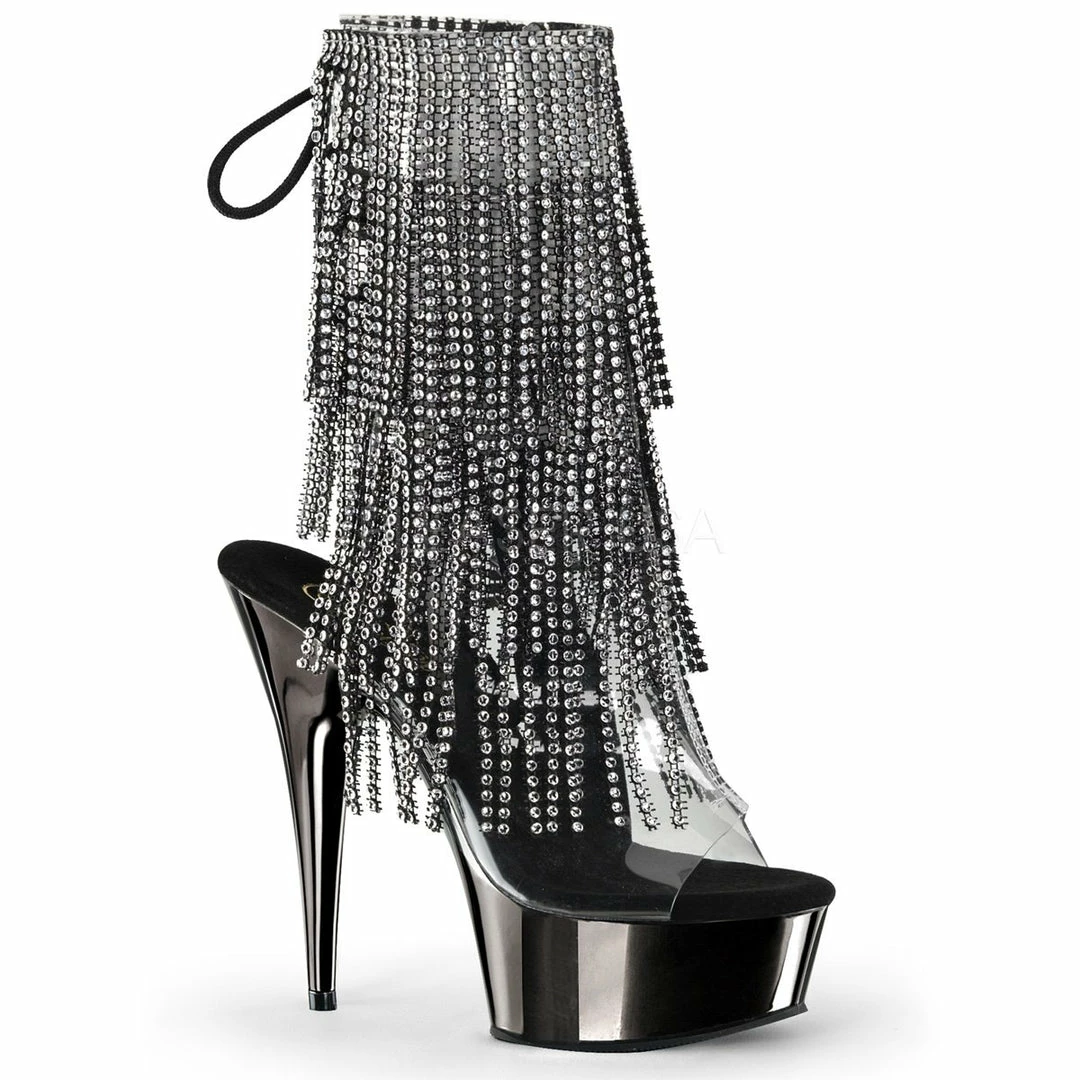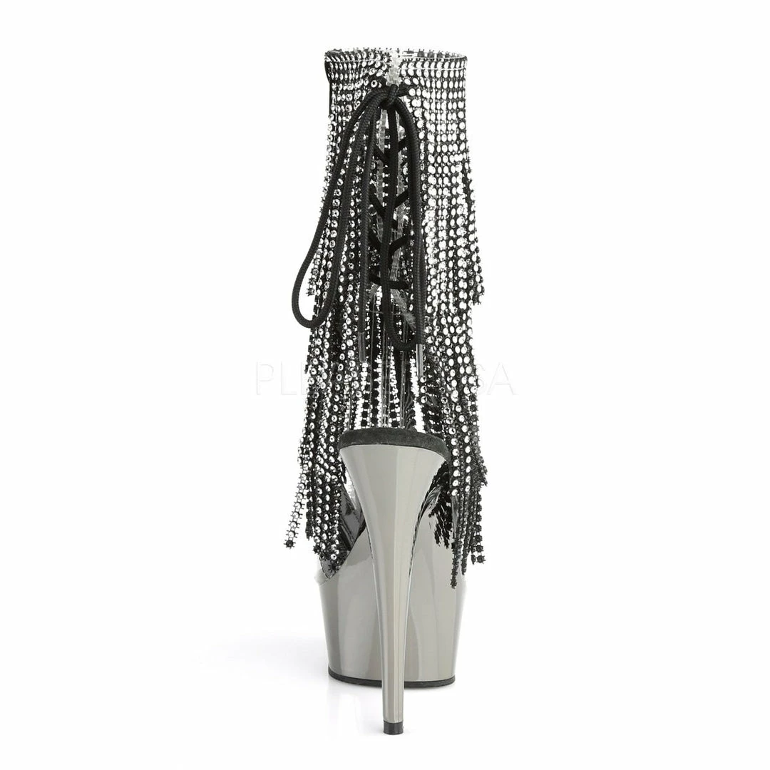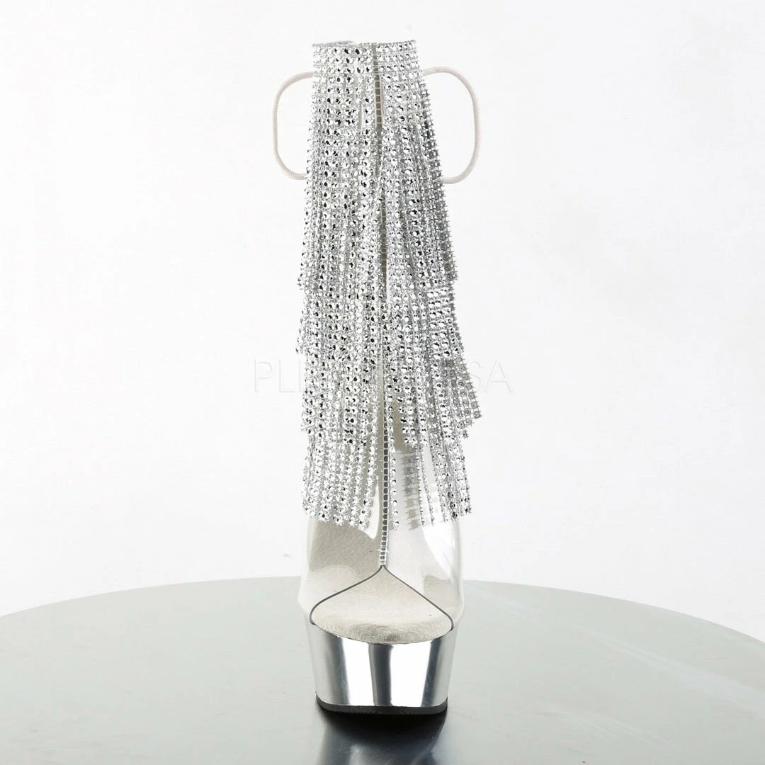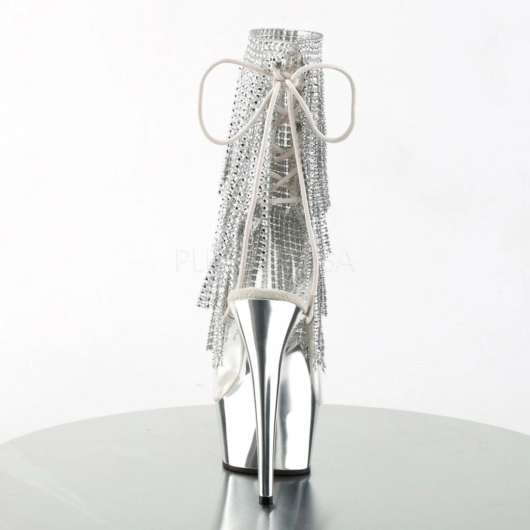 6″ (15.2cm) heel, 1/3/4″ (4.5cm) chrome plated platform, open toe/heel, back lace-up ankle boot featuring 4-layer chrome plated, simulated rhinestone fringe. Inside zip closure.