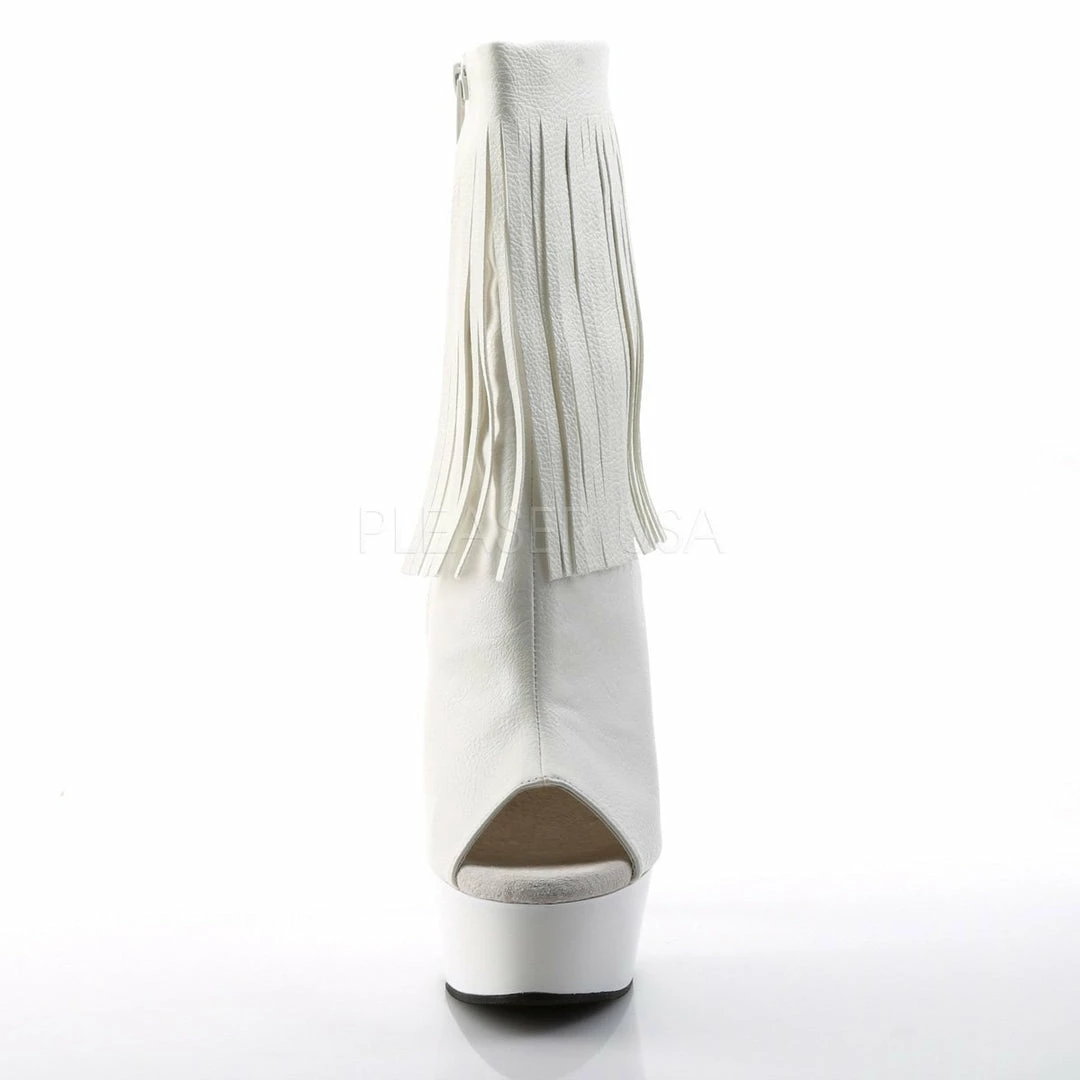 6″ (15.2cm) heel, 1/3/4″ (4.5cm) platformΒ open toe/heel fringe ankle boot. Inside zip closure.Β
