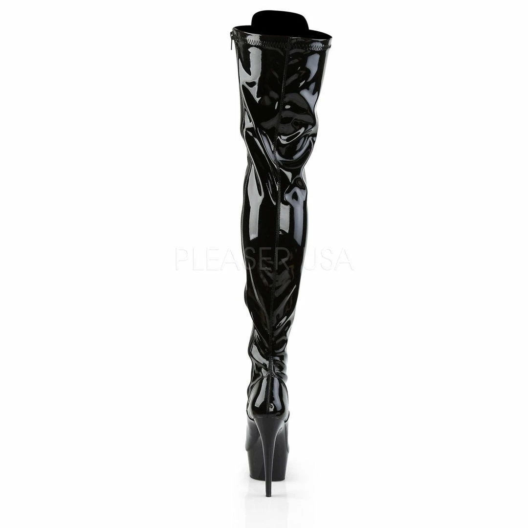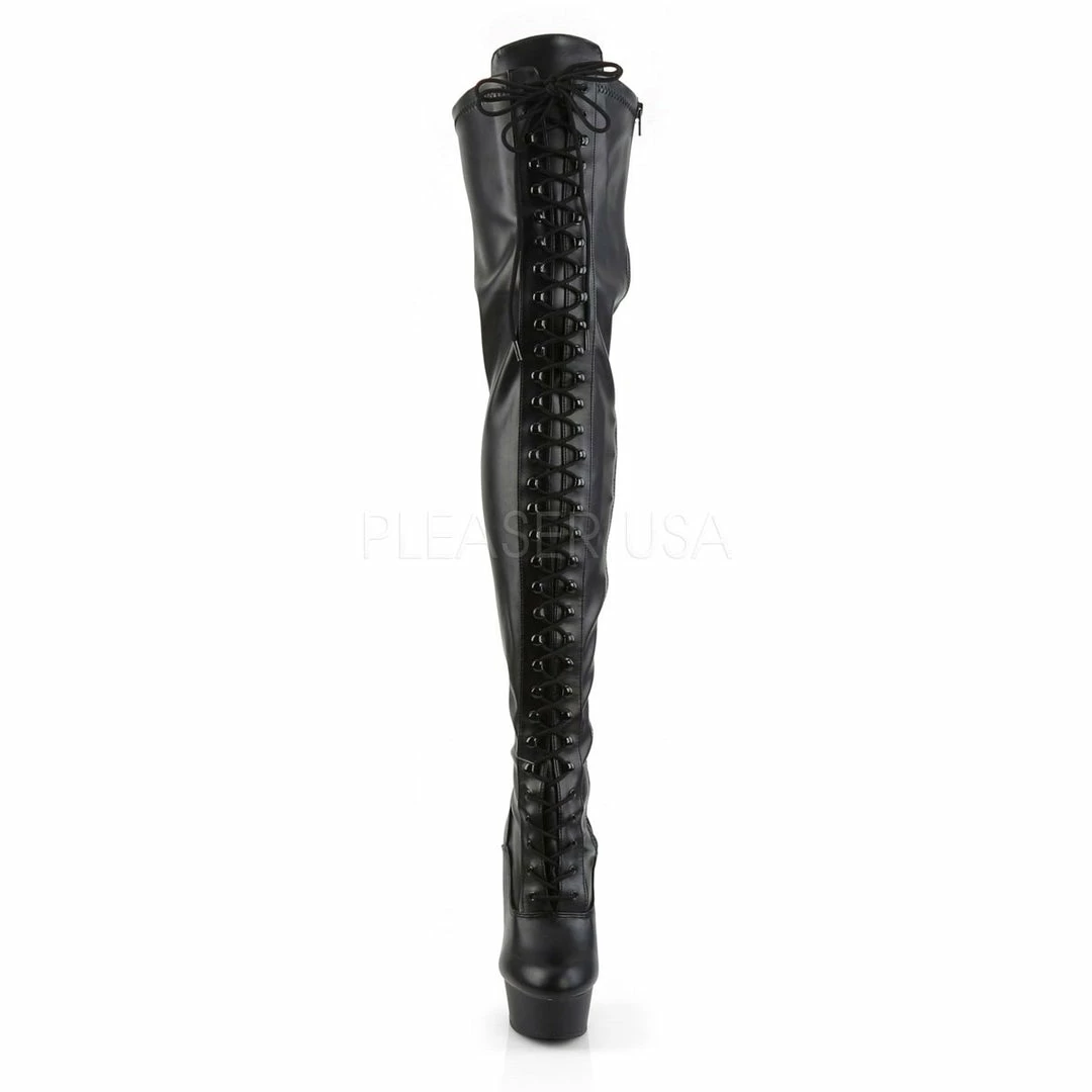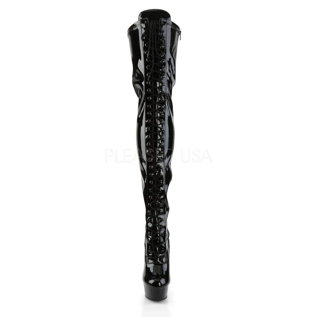 6″ (15.2cm) heel, 1/3/4″ (4.5cm) platform front lace-up stretch thigh boot, full inner side zipper.