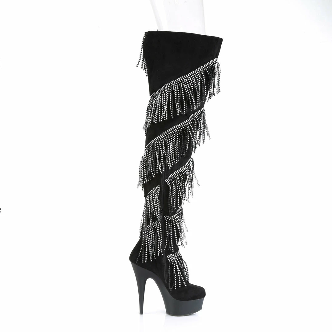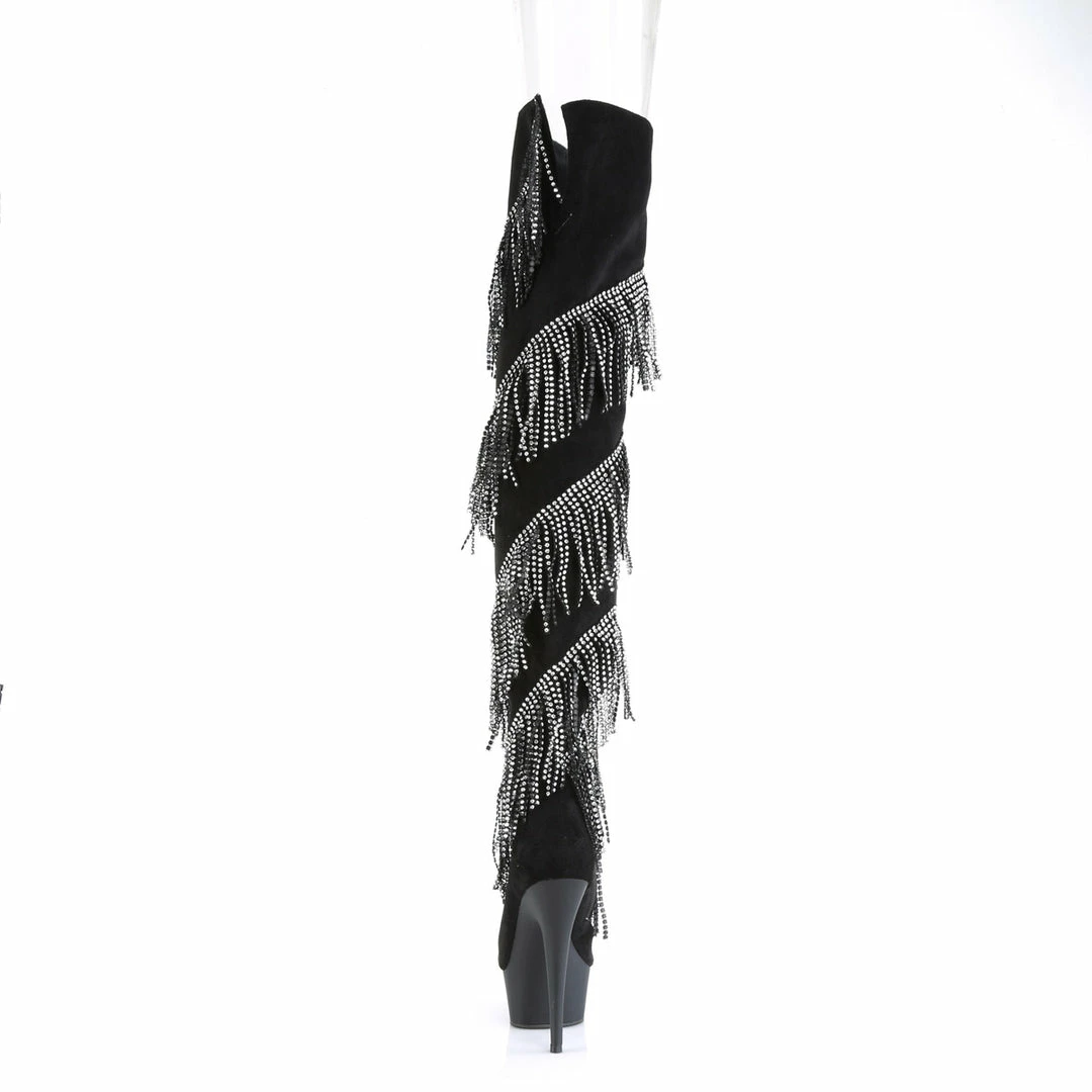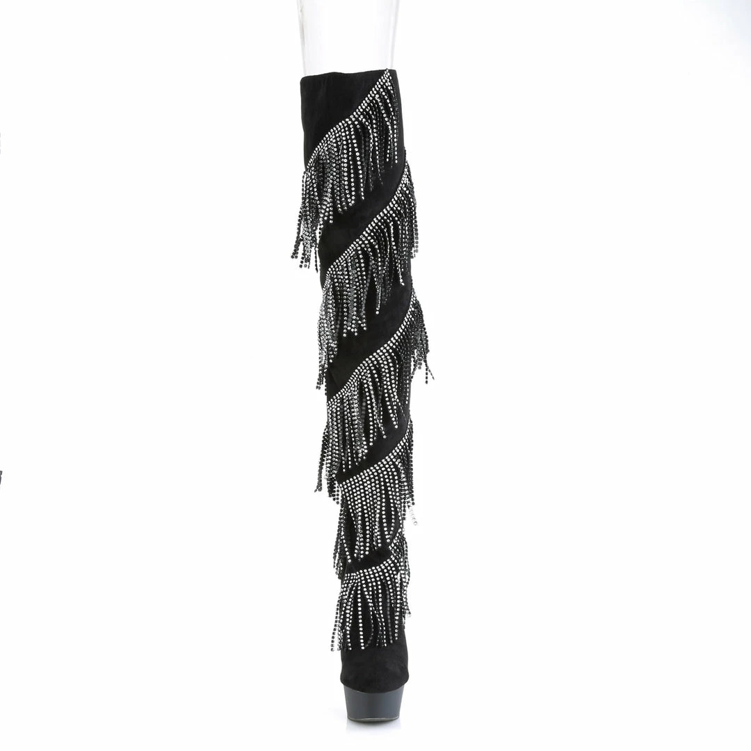 6″ (15.2cm) heel, 1/3/4″ (4.5cm) platform thigh high boot featuring 5-layer simulated rhinestone fringe, 1/2 inside zip closure.