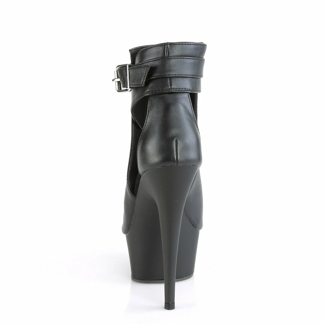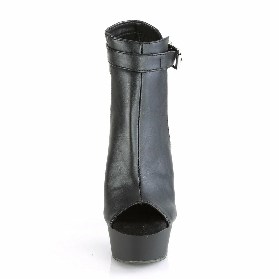 6″ (15.2cm) heel, 1/3/4″ (4.5cm) platform peep toe close back ankle bootie sandal featuring buckle ankle strap closure.