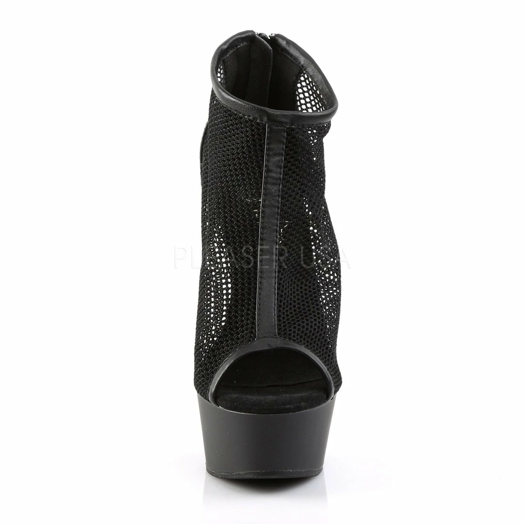 6″ (15.2cm) heel, 1/3/4″ (4.5cm) platform peep toe mesh bootie, back zip closure.