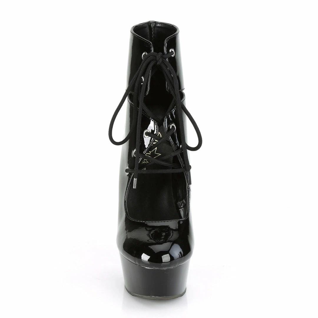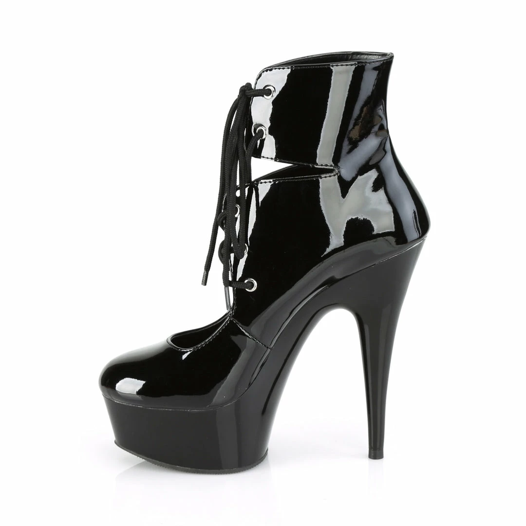 6″ (15.2cm) heel, 1/3/4″ (4.5cm) platformΒ cutoutΒ ankle bootie featuring lace-up ties at front.
