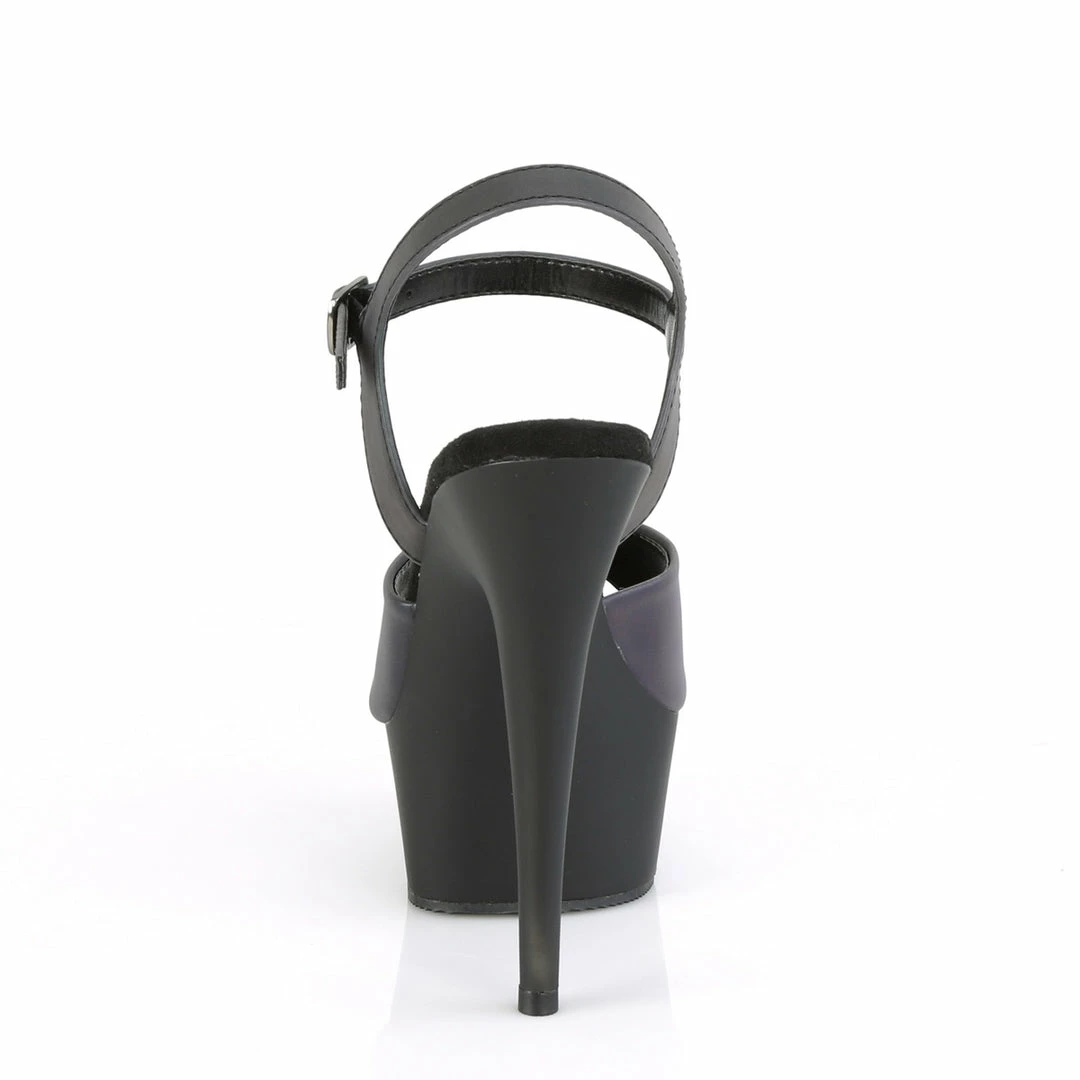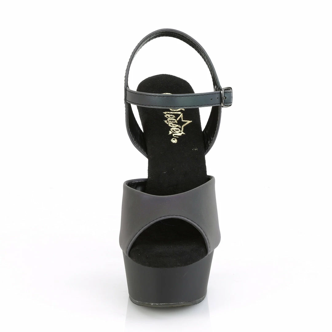 6″ (15.2cm) heel, 1/3/4″ (4.5cm) platformΒ ankle strap sandal featuring reflective effect upper.