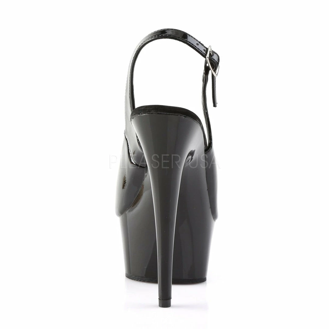 6″ (15.2cm) stiletto heel, 1 1/2″ (3.8cm) platform peep toe sling back sandal.