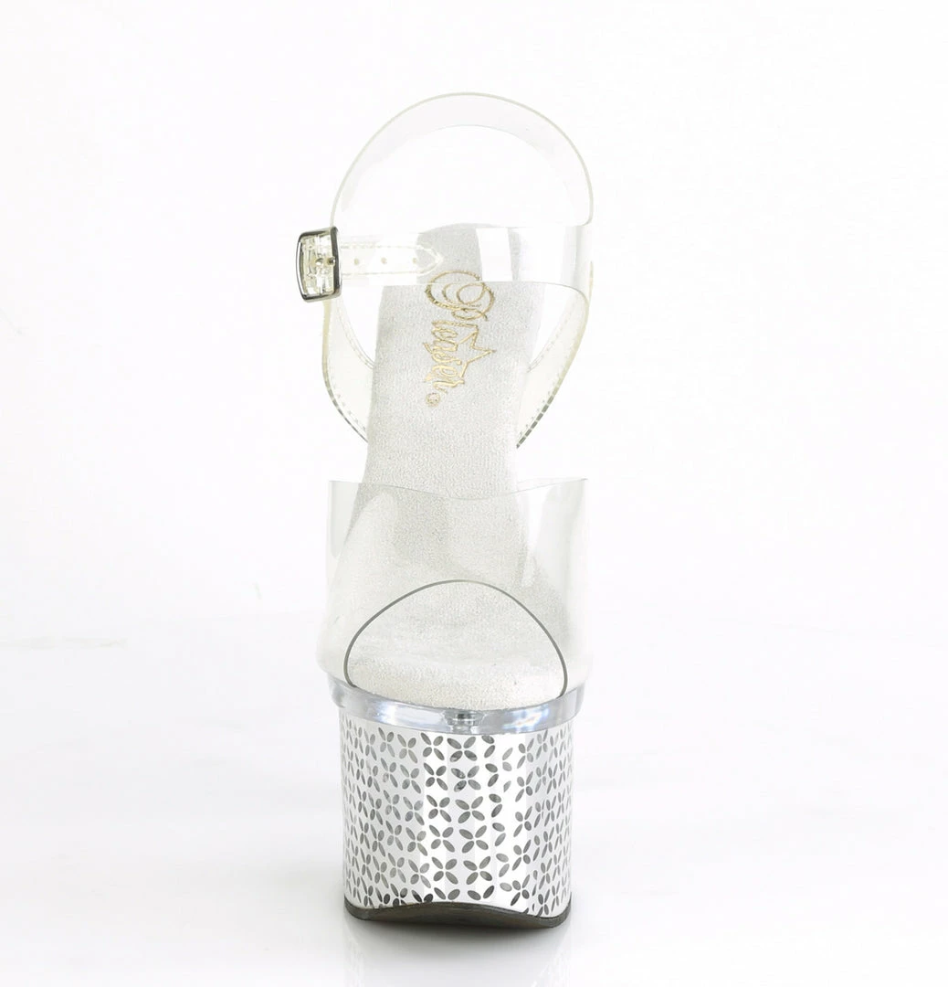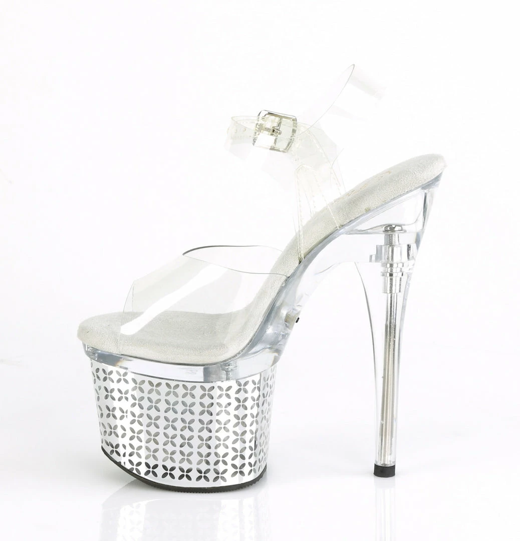 7″ (17.8cm) heel, 3″ (7.6cm)Β platformΒ USB chargeable LED light-up ankle strap sandal withΒ multicolor disco lighting effects in various patterns/settings featuring chrome plated platform with flowers.