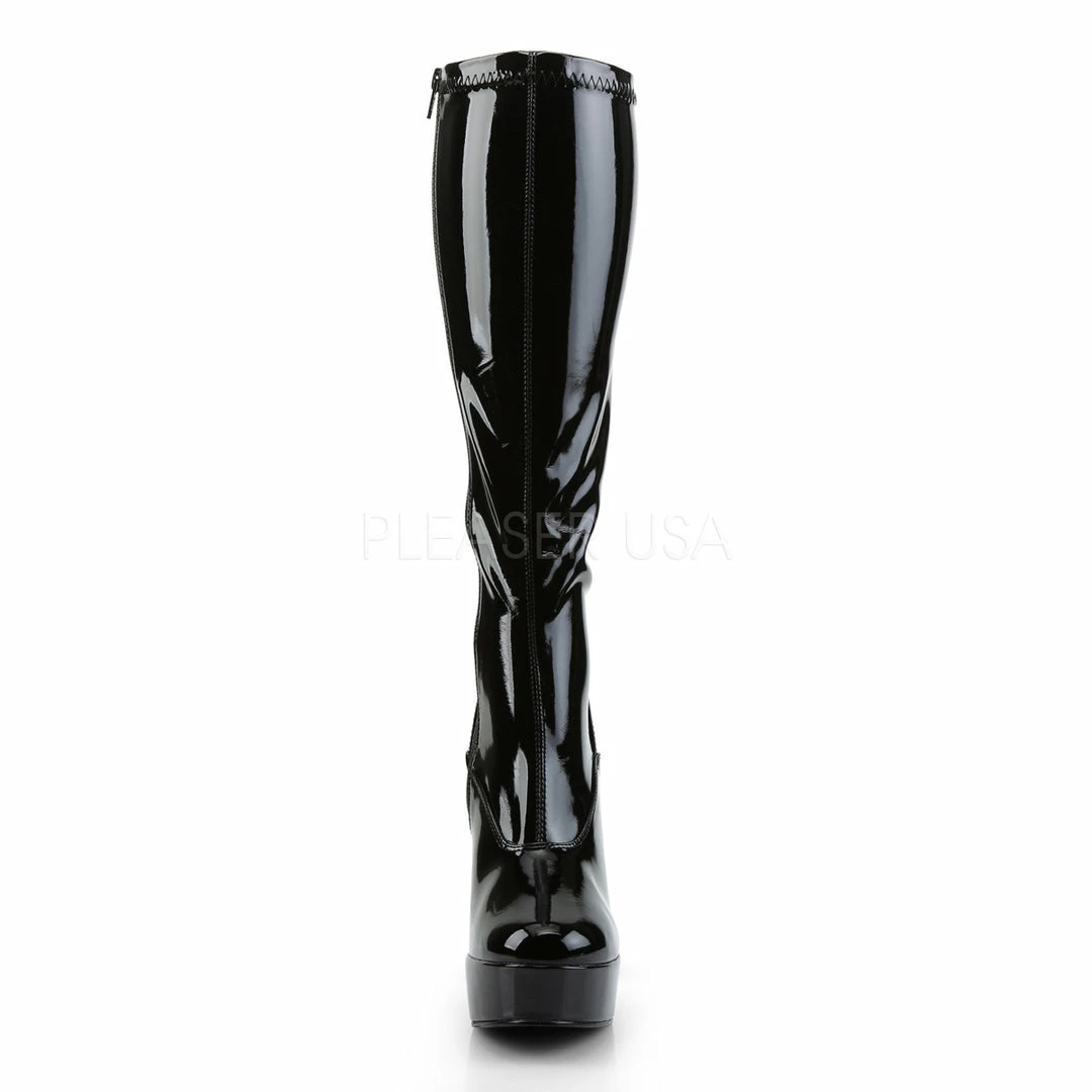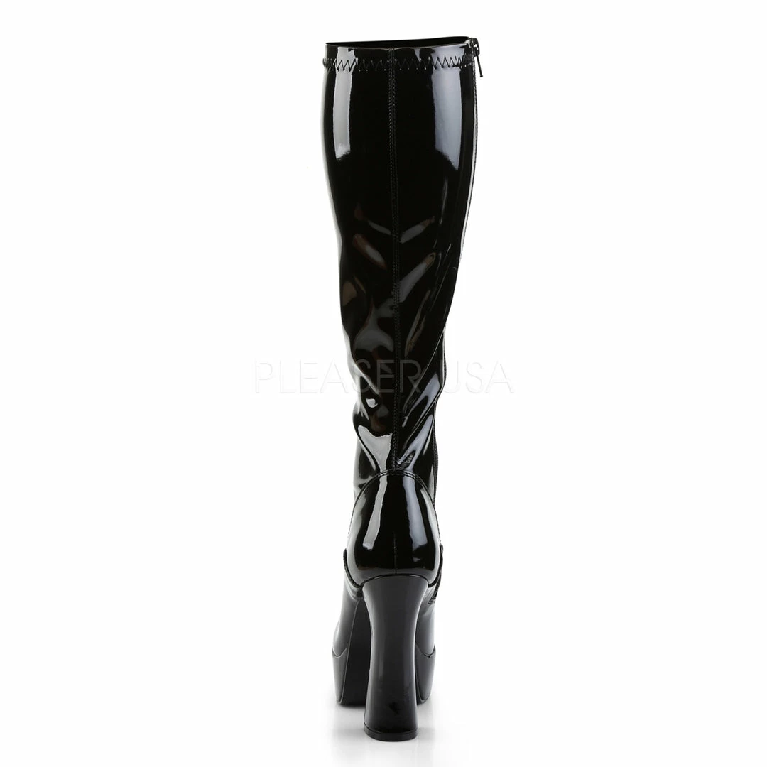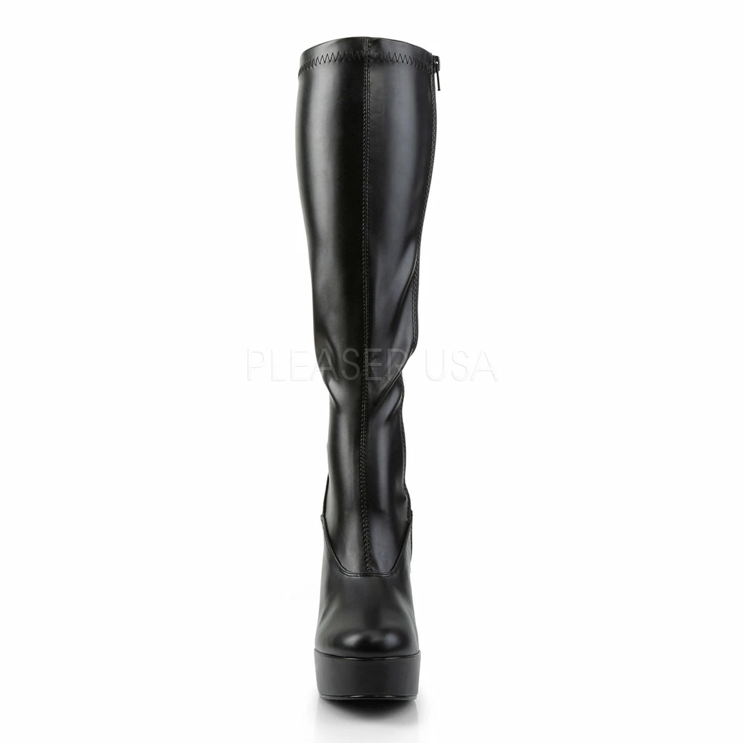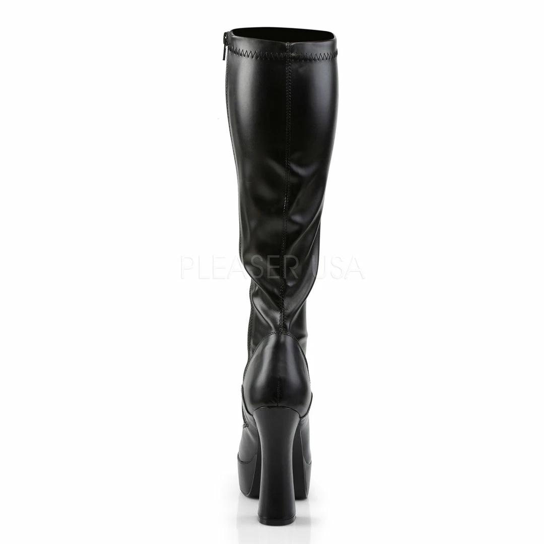 5″ (12.7cm) stack heel, 1 1/2″ (3.8cm) platform stretch knee boot with full inner side zipper.
