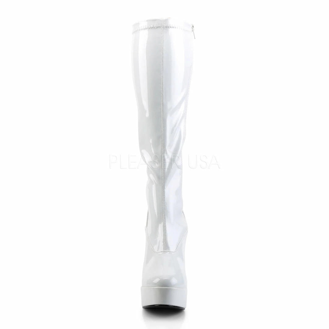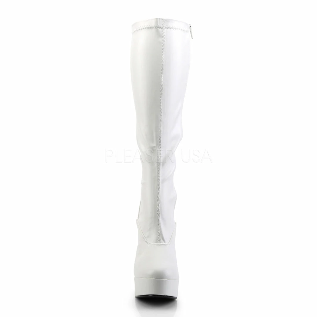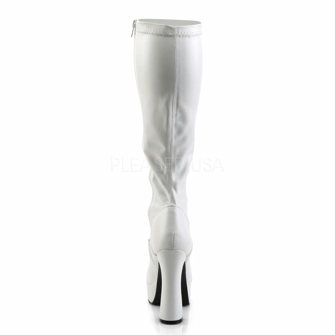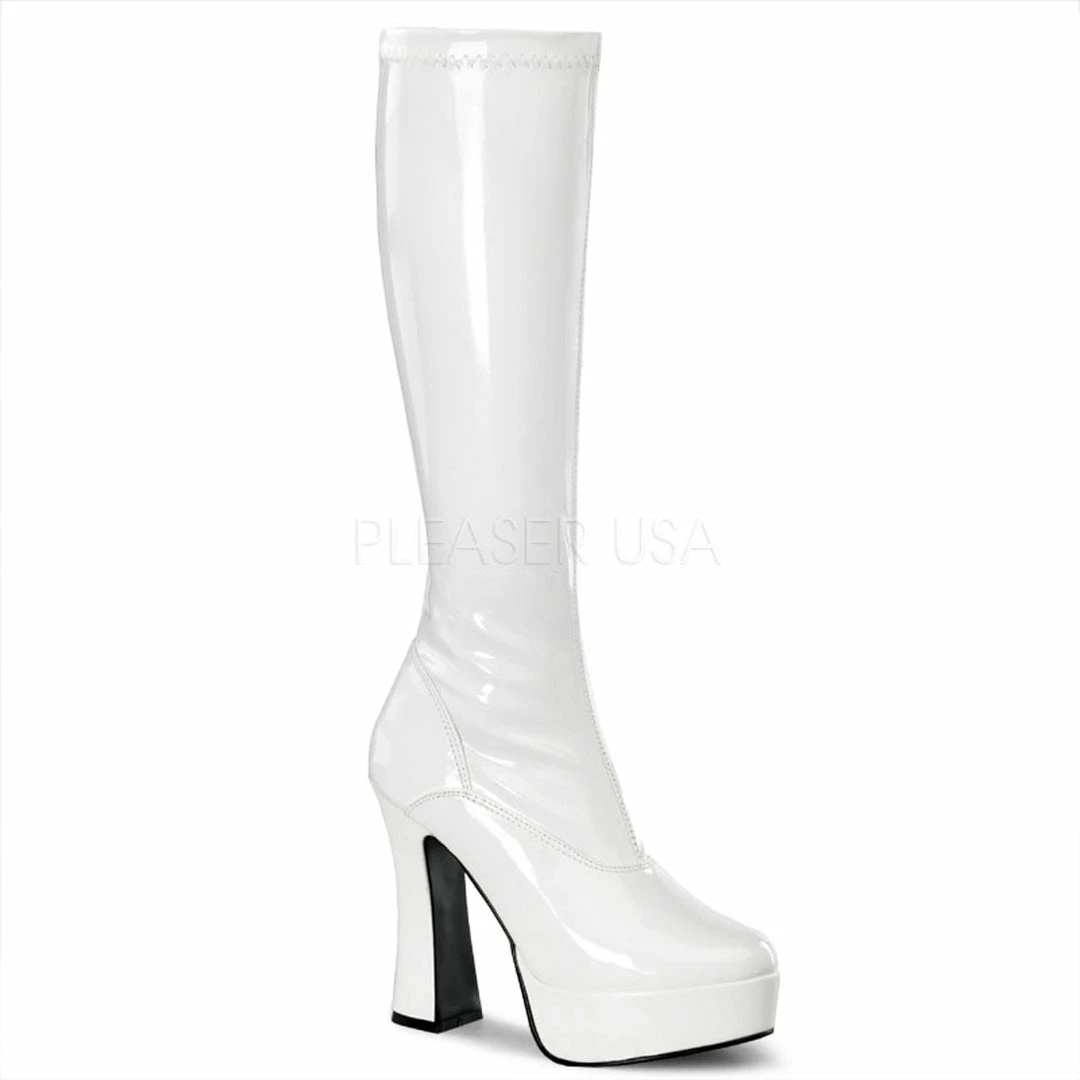 5″ (12.7cm) stack heel, 1 1/2″ (3.8cm) platform stretch knee boot with full inner side zipper.