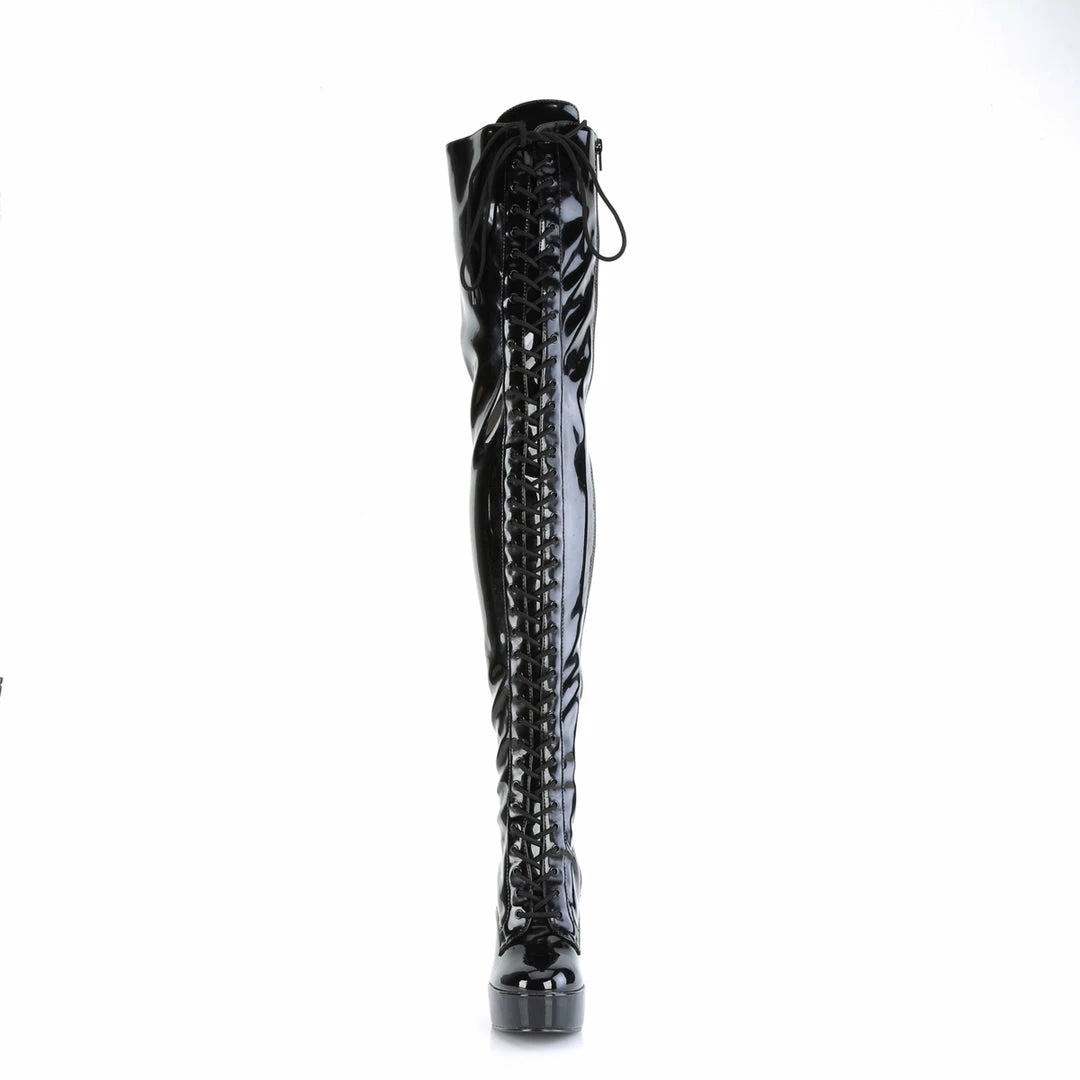 5″ (12.7cm) stack heel, 1 1/2″ (3.8cm) platform lace up front stretch thigh high boot with full length inside zip closure.