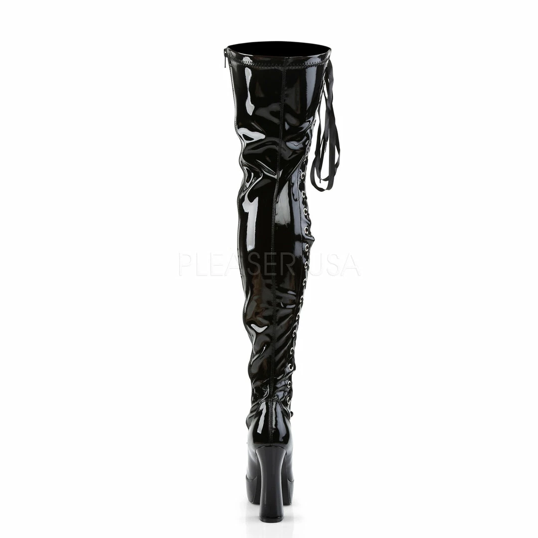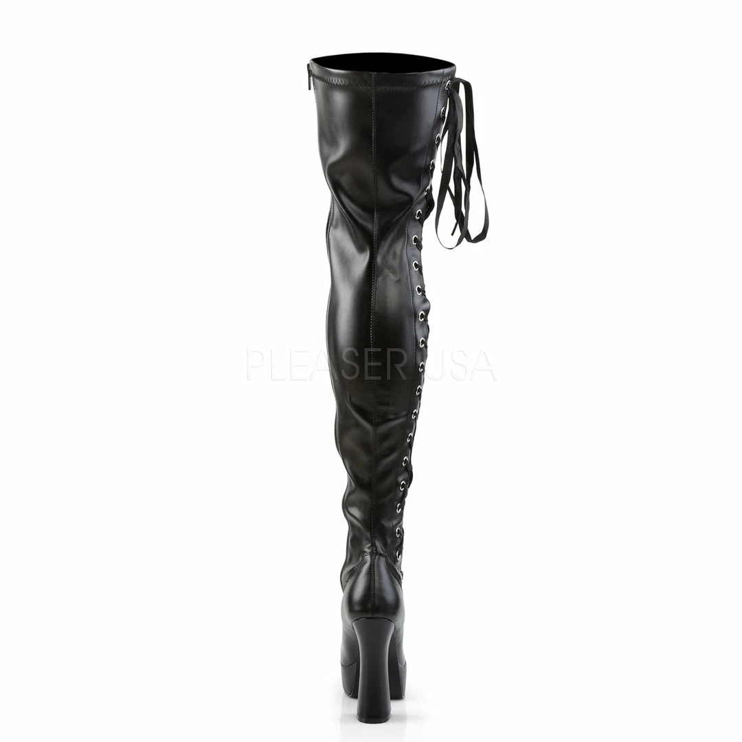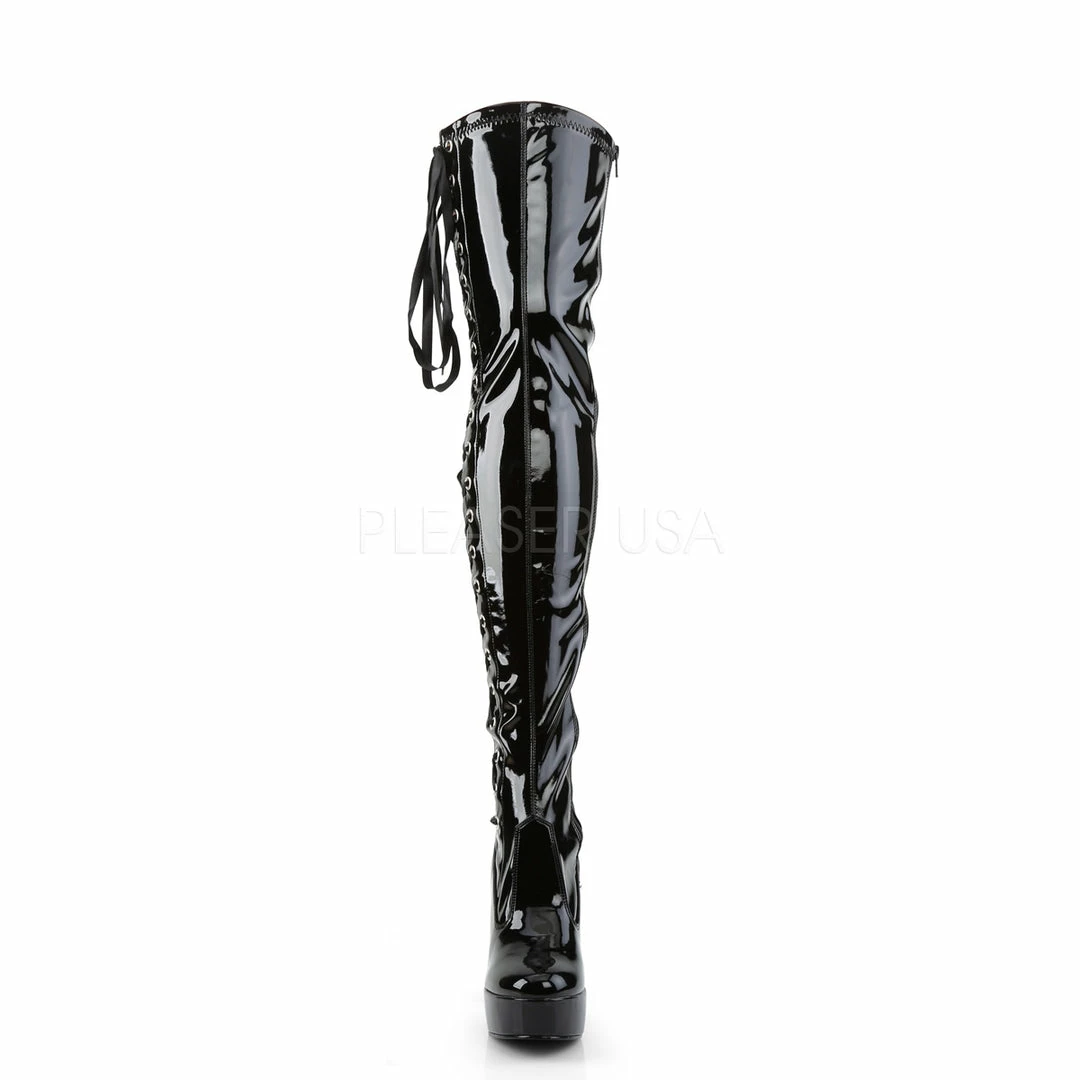 5″ (12.7cm) stack heel, 1 1/2″ (3.8cm) platform stretch thigh high boot with lace-up sides, interchangeable black and red ribbon laces and full length inside zip closure.