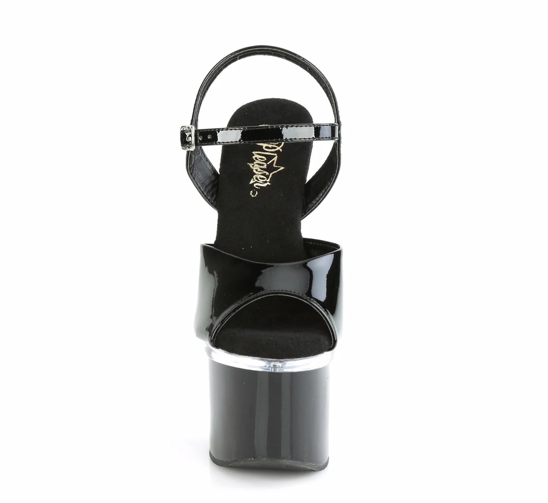 7″ (17.8cm) heel, 3″ (7.7cm) platform ankle strap sandal.Β