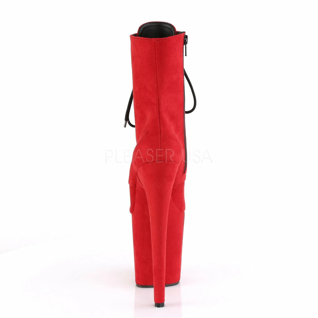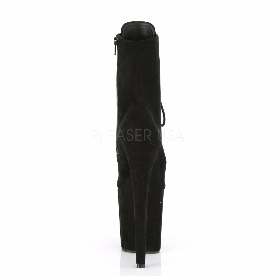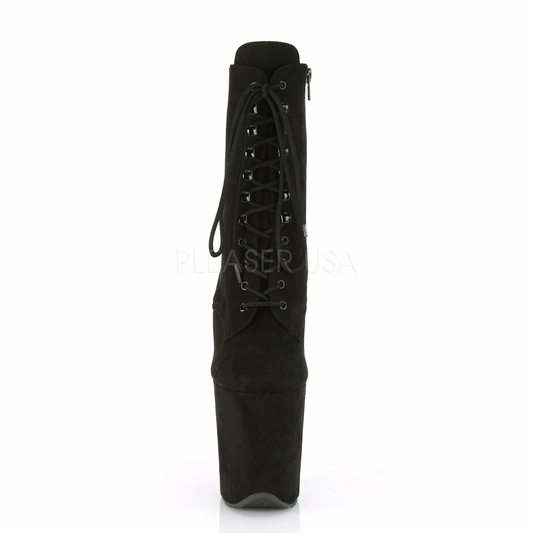 4″ (20cm) heel, 4″ (10cm)Β platform lace up front ankle boot featuring fully wrapped platform bottom and inside zip closure.