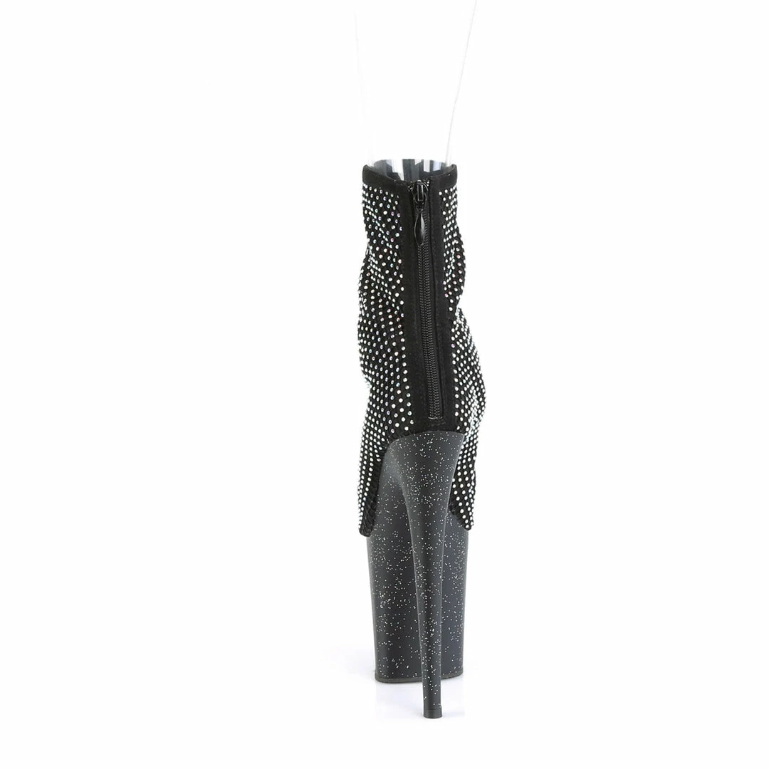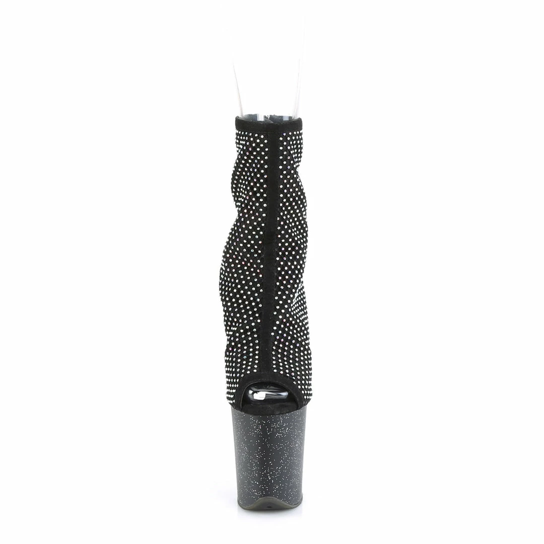 8″ (20cm) heel, 4″ (10cm)Β platformΒ peep toe ankle boot featuring faux suede upper with AB rhinestone mesh fabric overlay and mini iridescent glitters on the entire platform bottom, back zip closure
