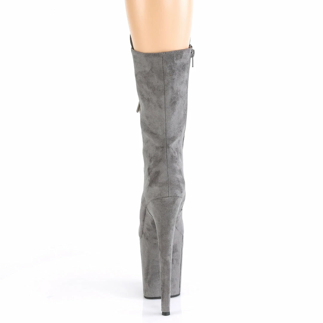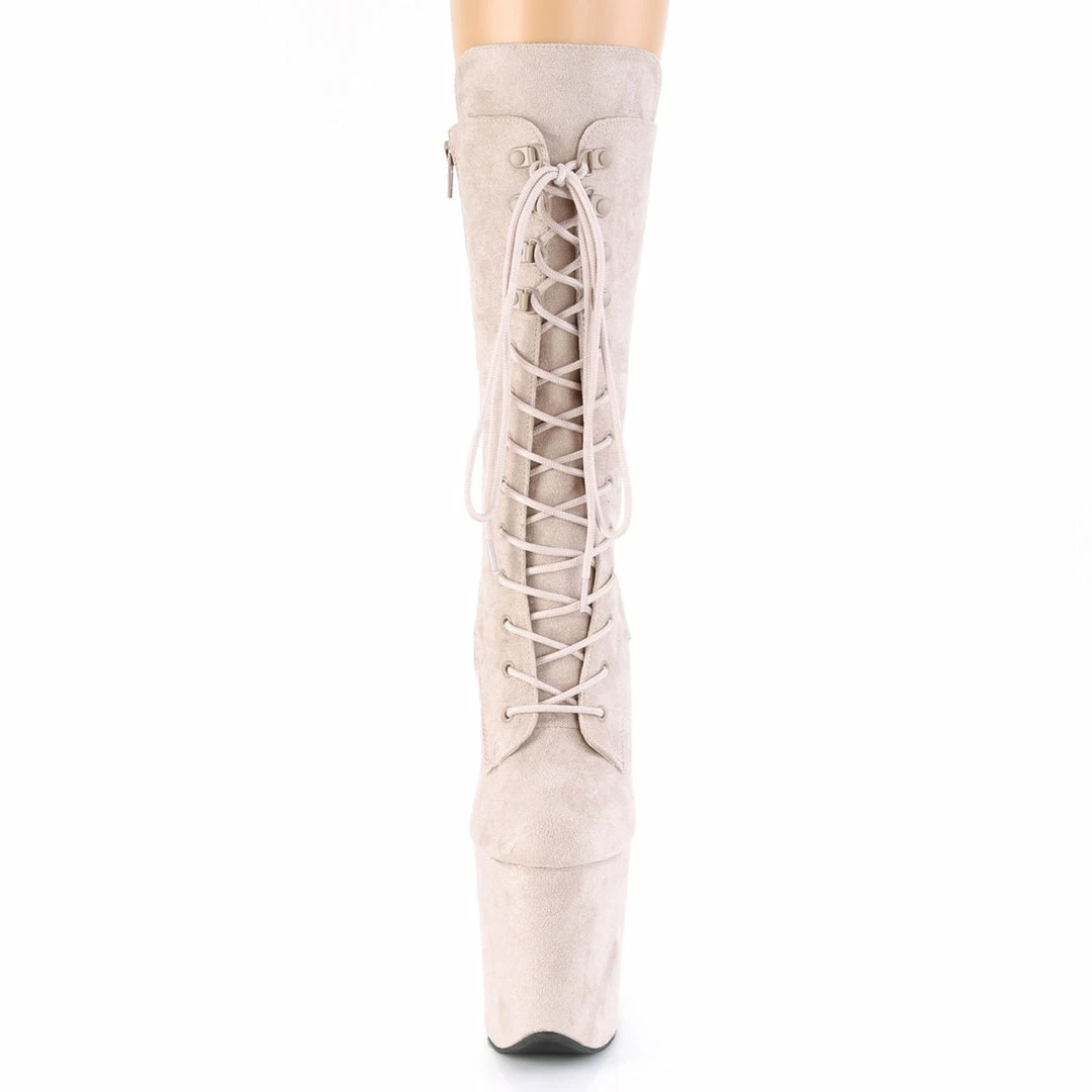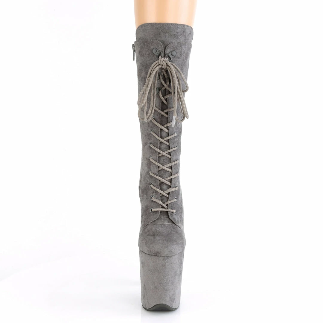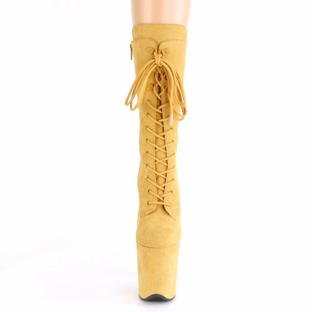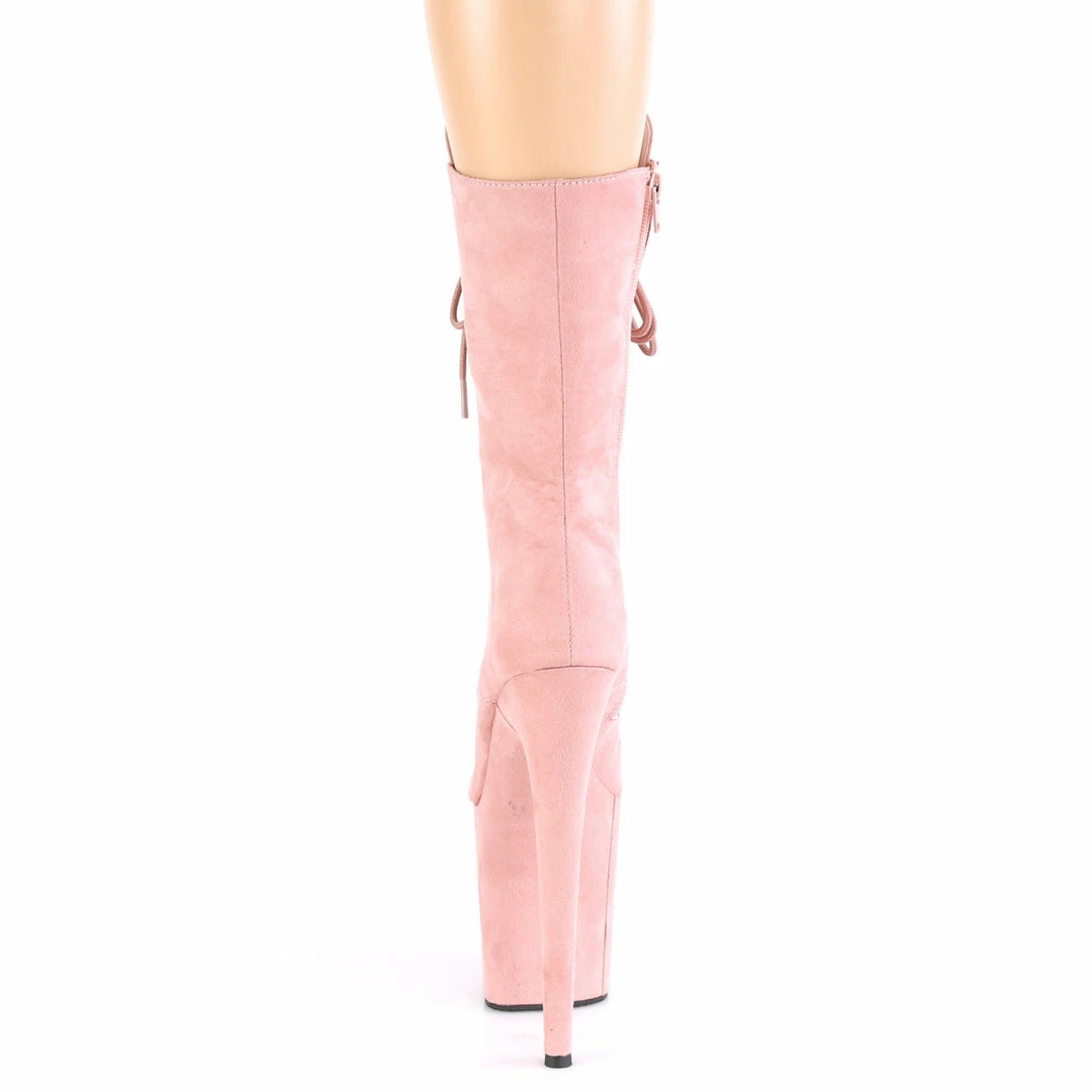 8″ (20.3cm) stiletto heel, 4″ (10.2cm)Β platform lace up front mid-calf boot featuring fully wrapped platform bottom with inside zip closure, matching and black shoe laces.