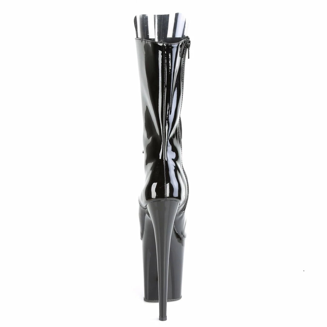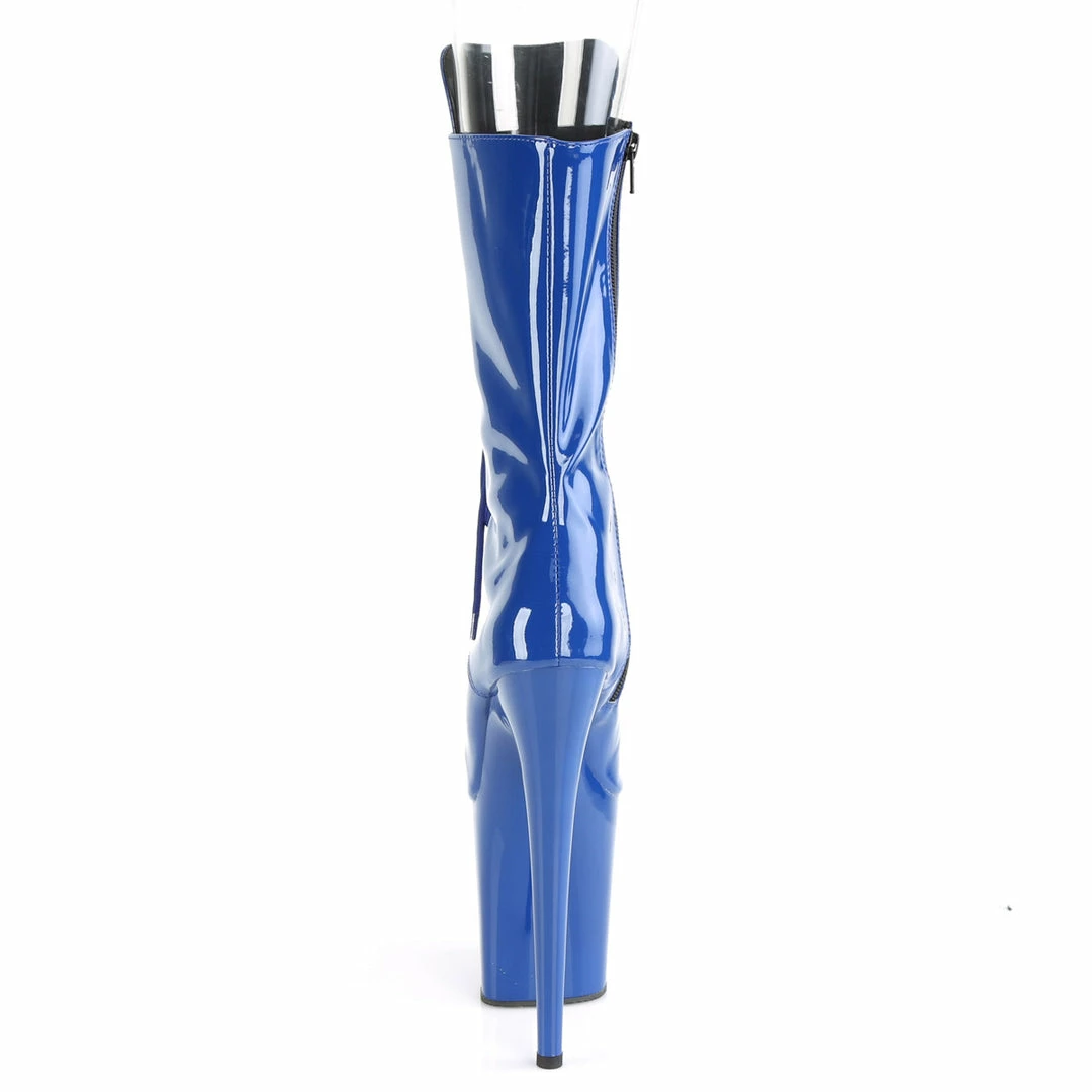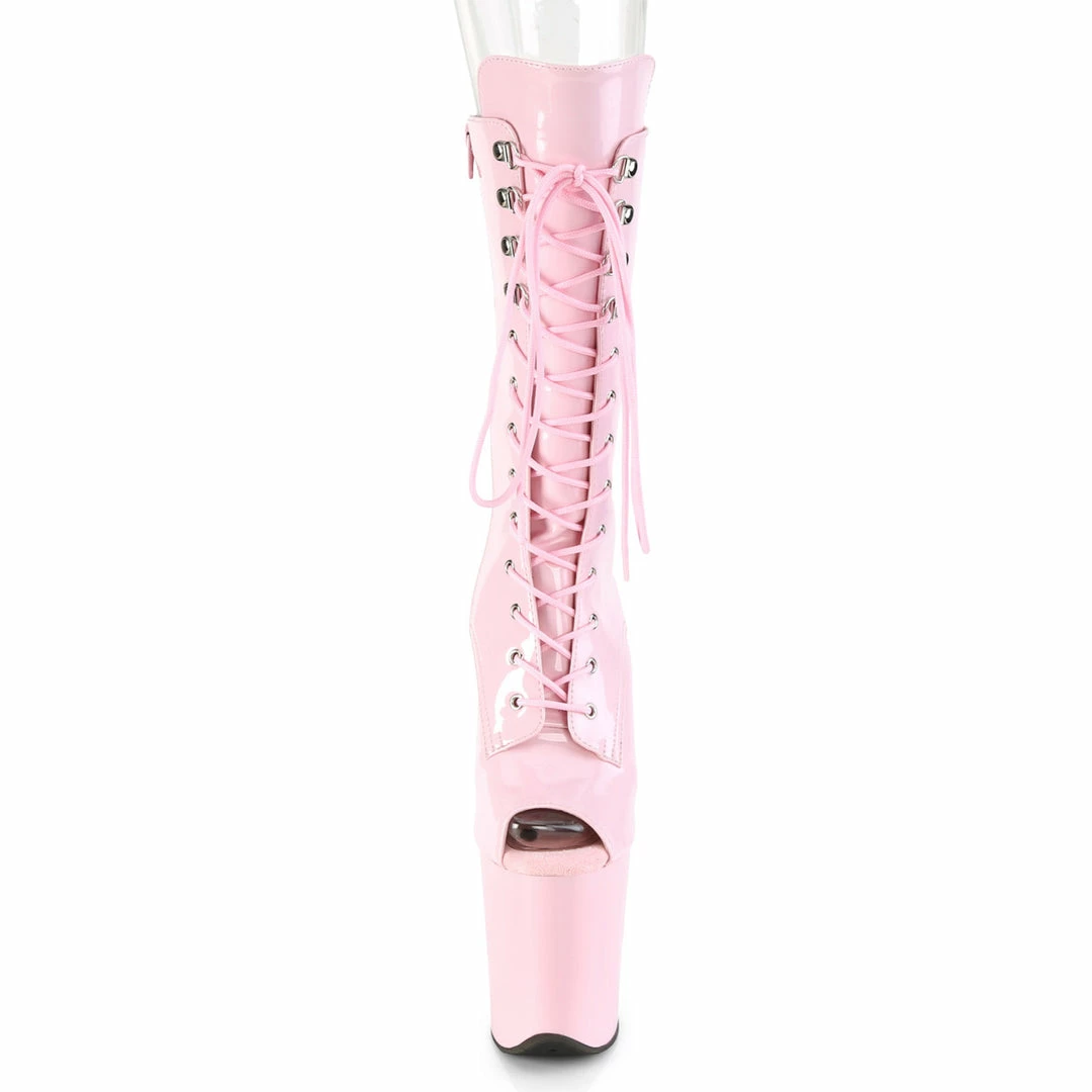 8″ (20cm) stiletto heel, 4″ (10cm) platform peep toe lace up front mid-calf boot with inside zip closure.