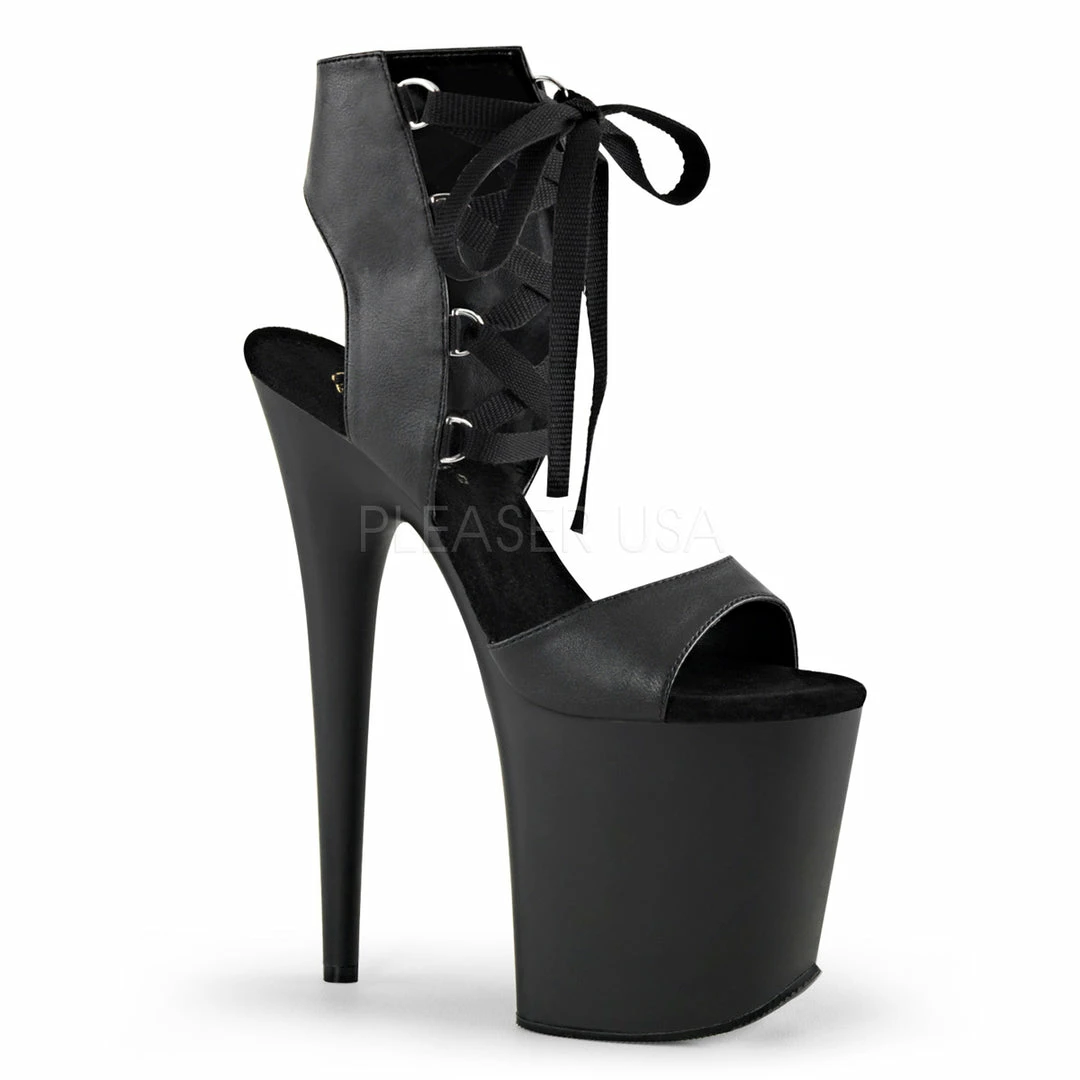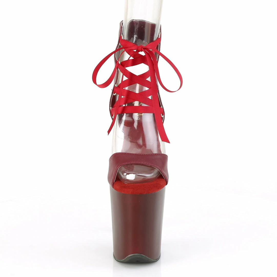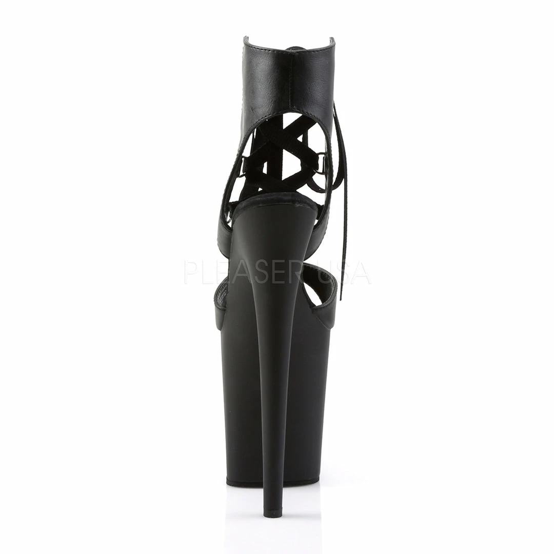 8″ (20.3cm) stiletto heel, 4″ (10.2cm) platform lace-up front bootie sandal.