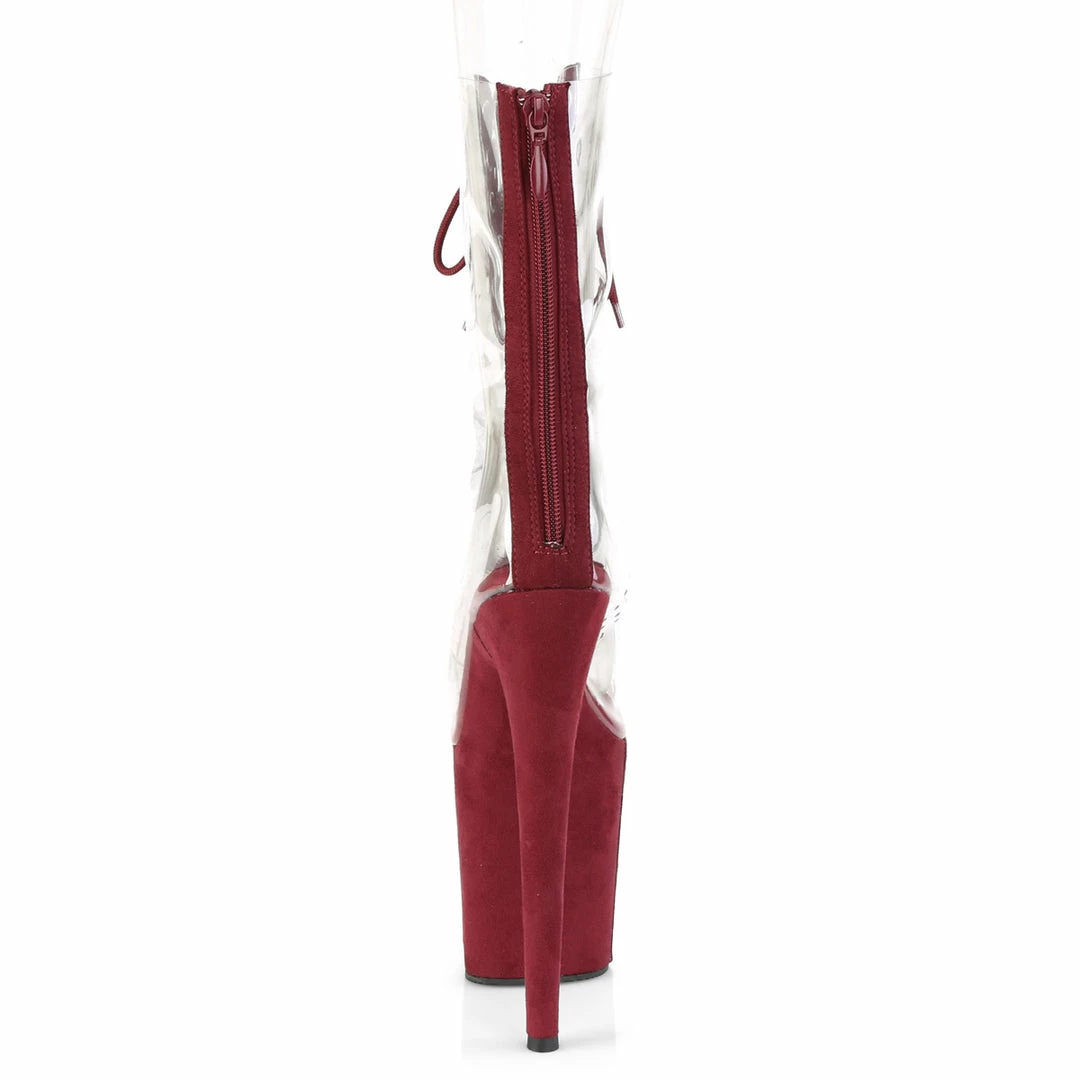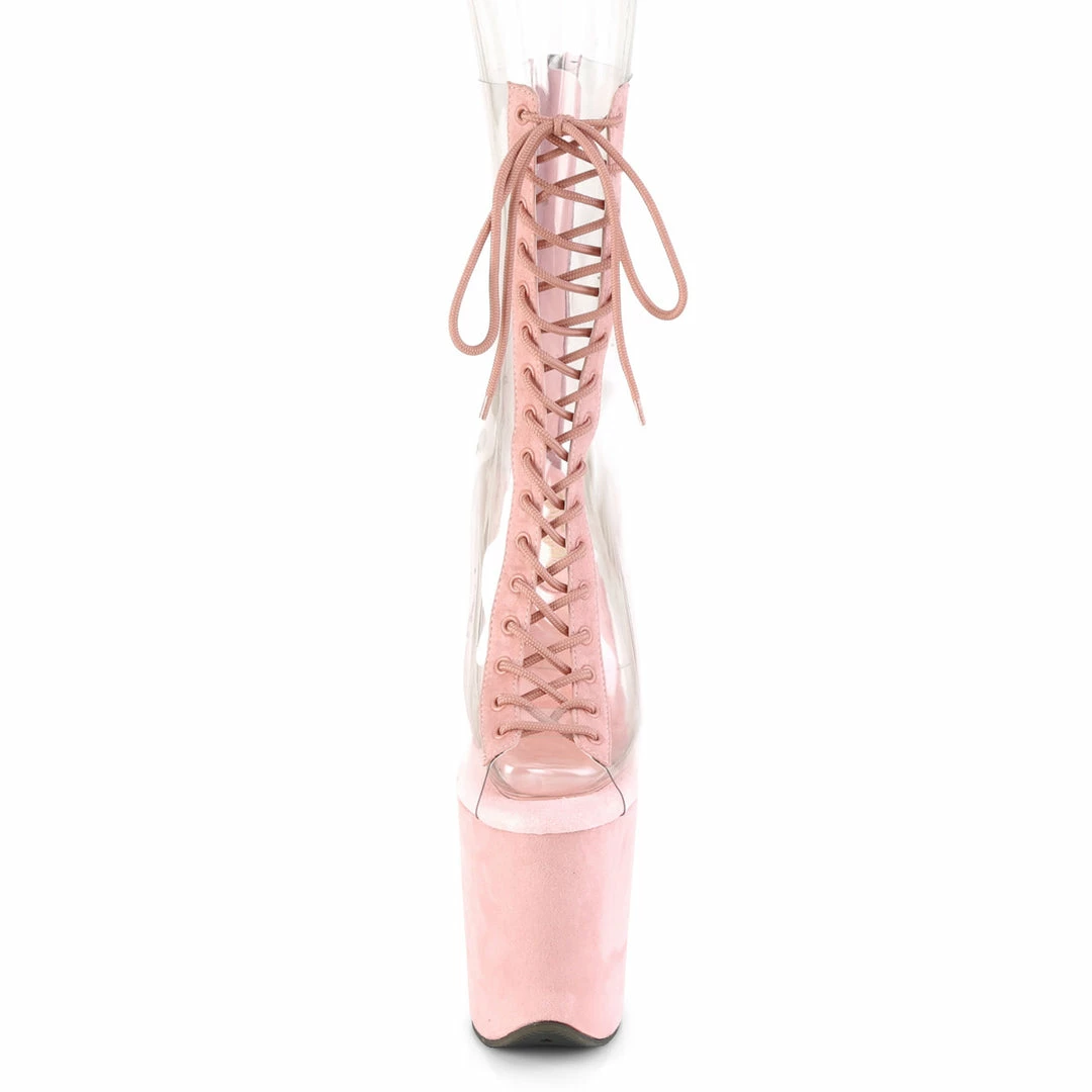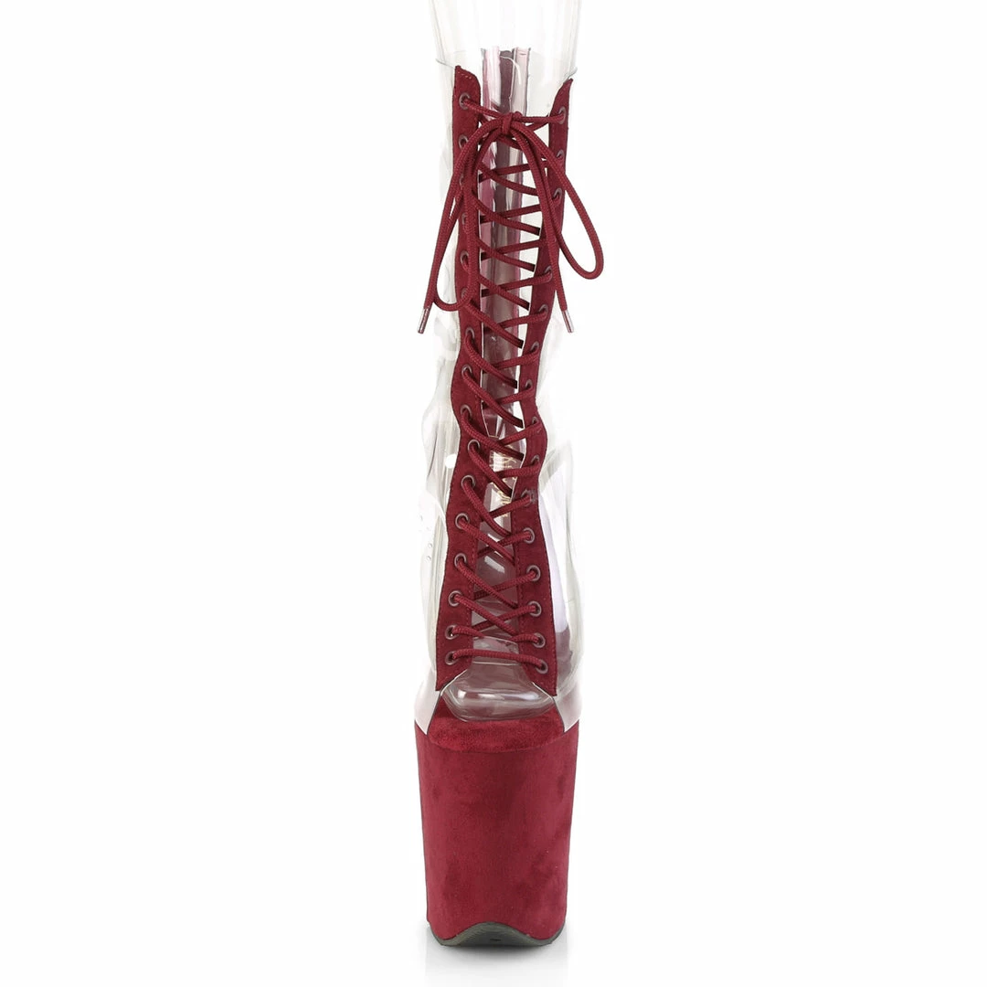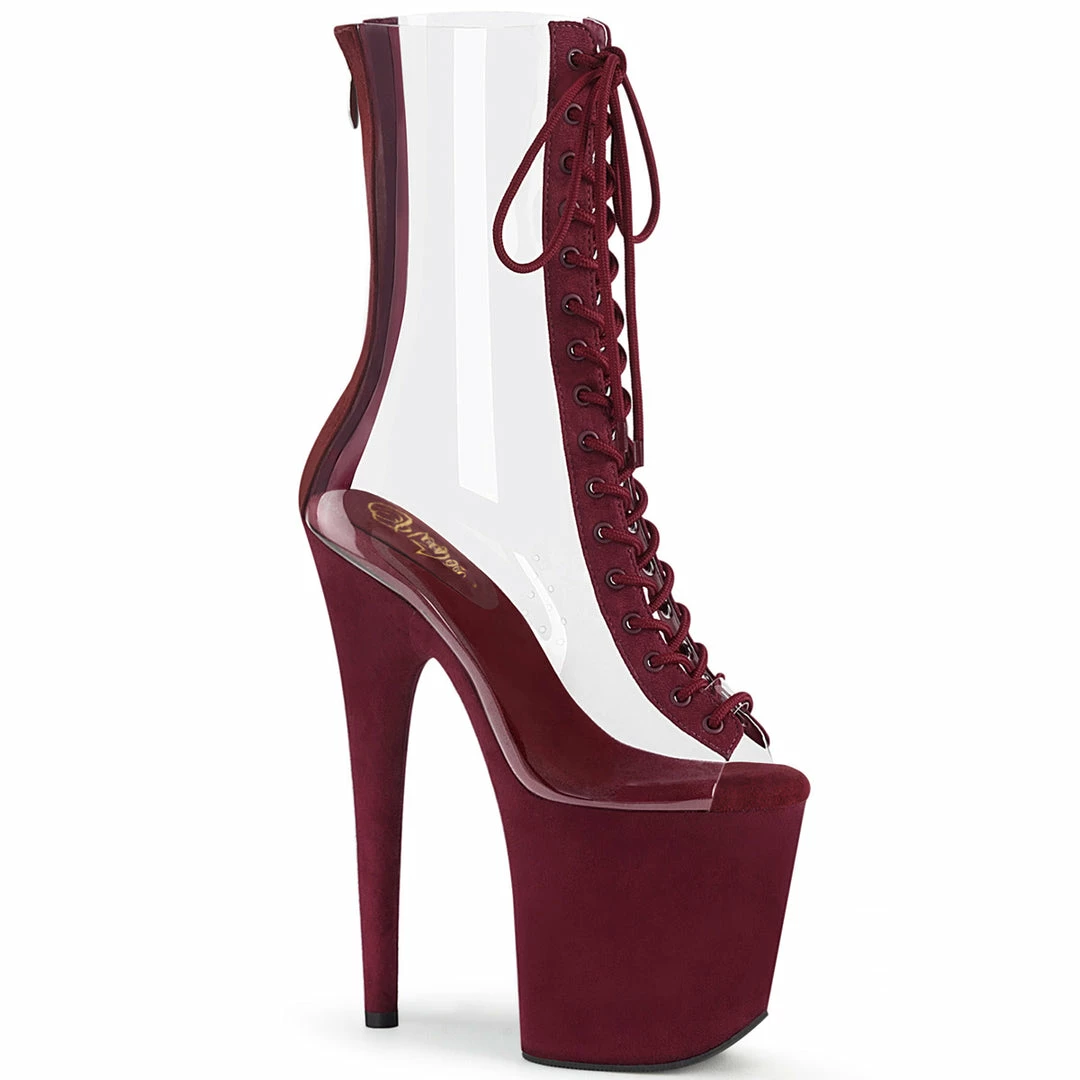 8″ (20cm) stiletto heel, 4″ (10cm)Β platform lace up front peep toe ankle boot featuring fully wrapped platform bottom and full back zip closure.