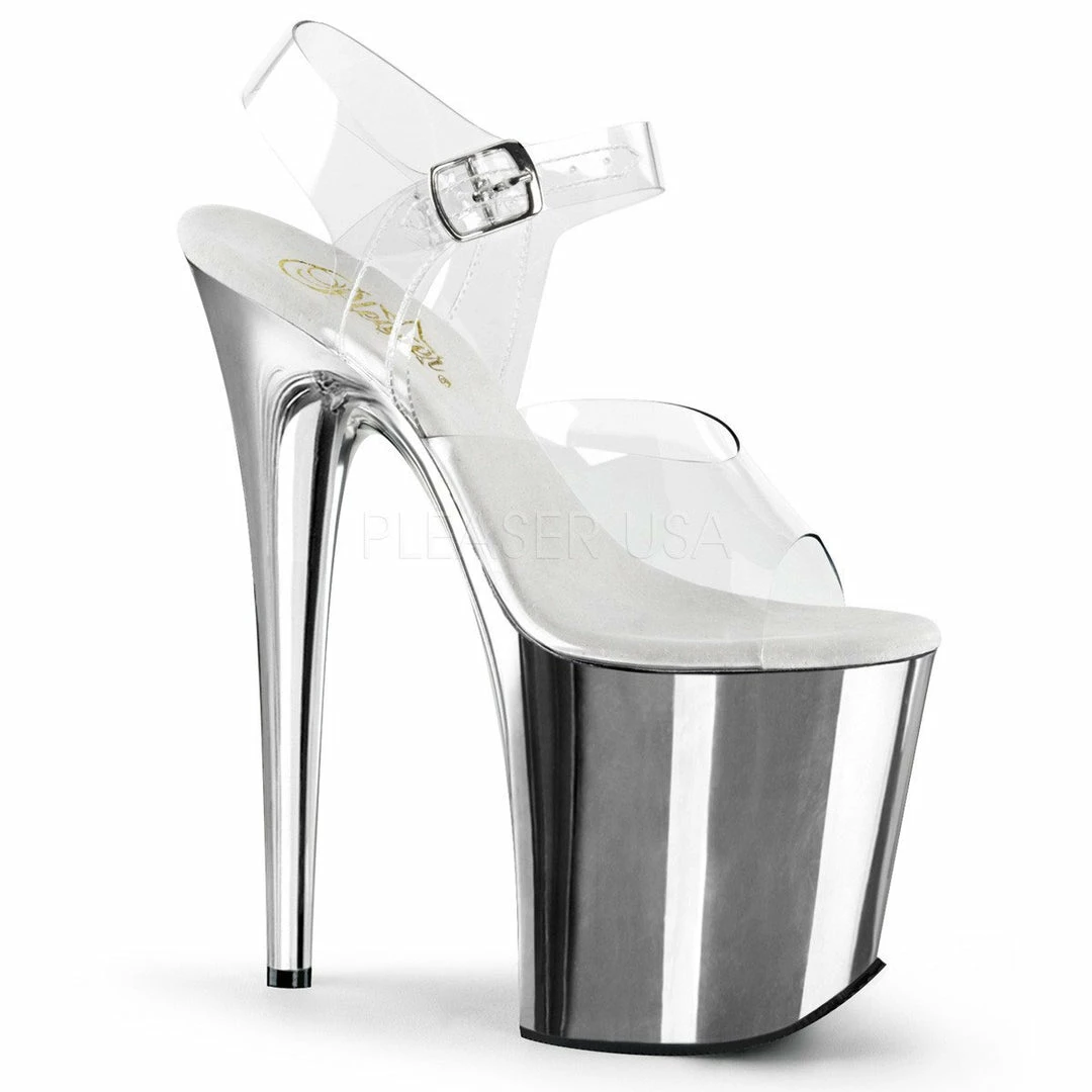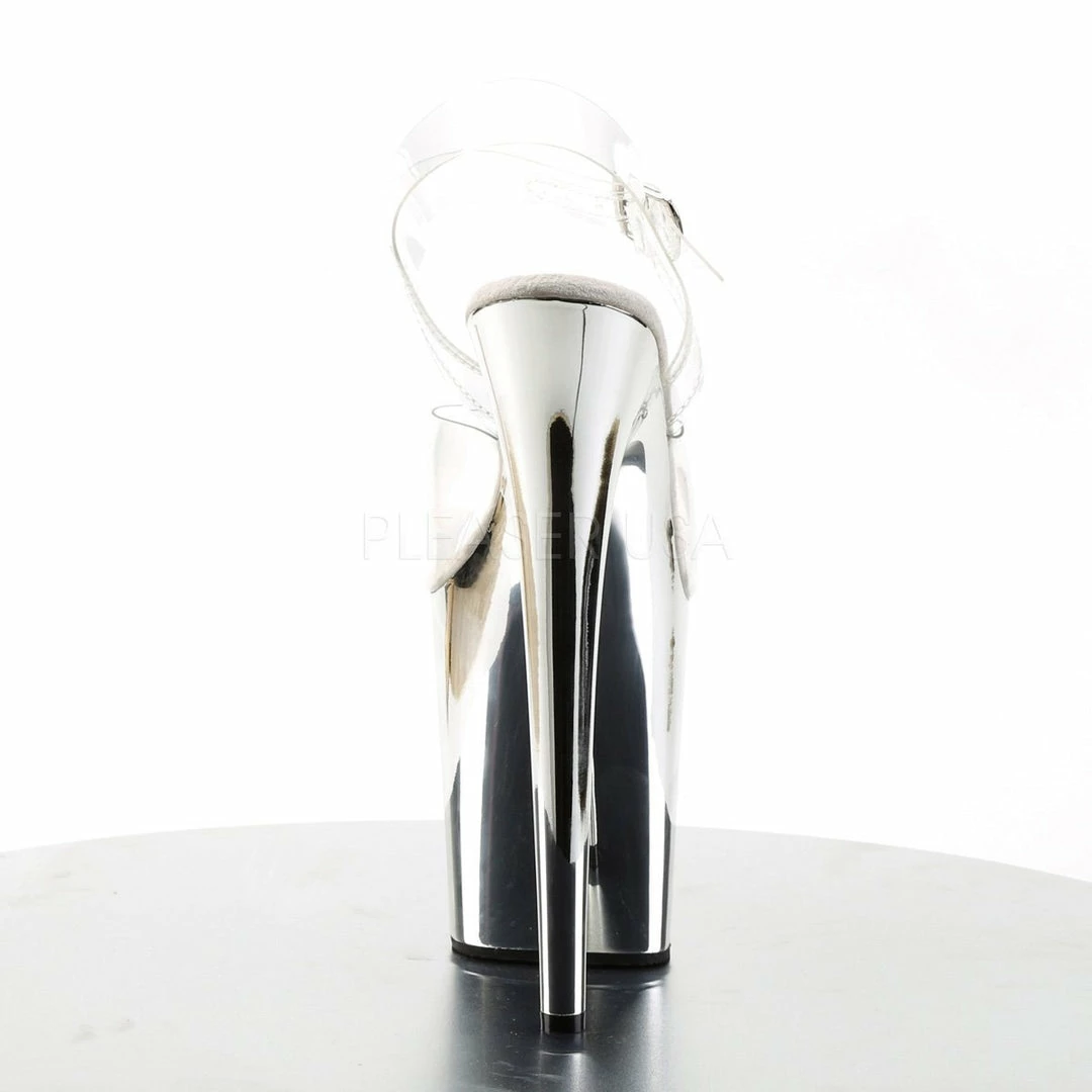 8″ (20.3cm) stiletto heel, 4″ (10.2cm) chrome plated platform ankle strap sandal.