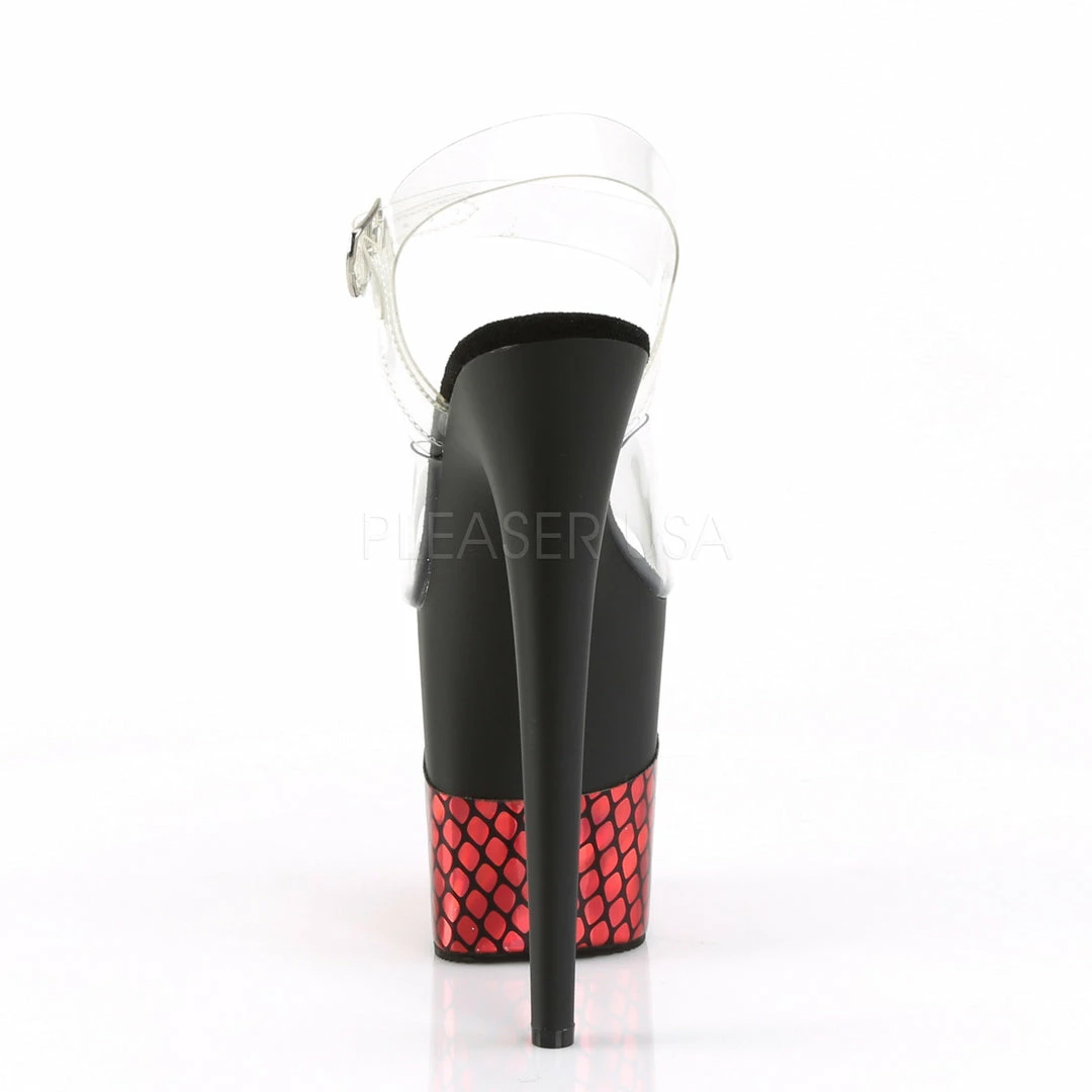 8″ (20.3cm) stiletto heel, 4″ (10.2cm) platform ankle strap sandal featuring holographic fishnet print wrapped bottom.