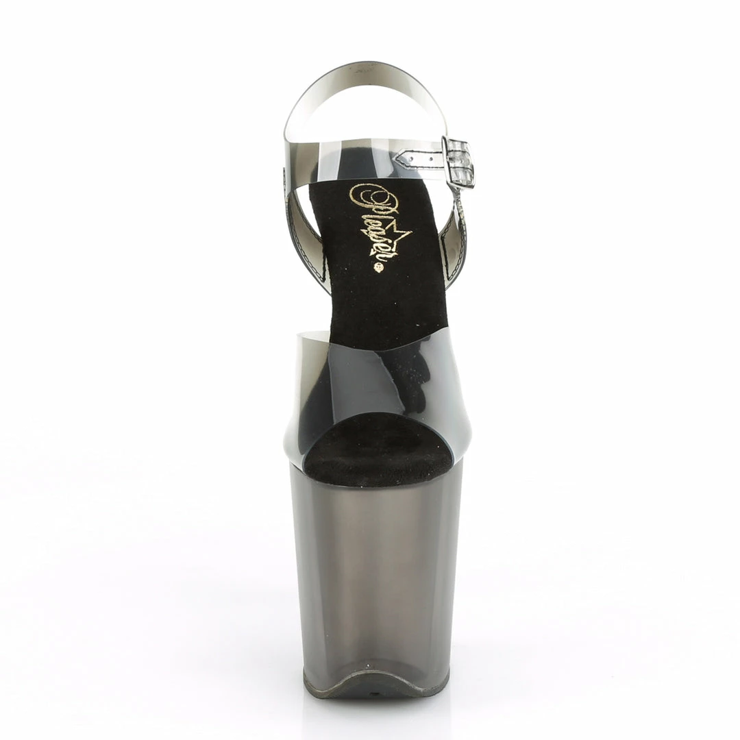 8″ (20cm) heel, 4″ (10cm) tinted platform ankle strap sandal.
