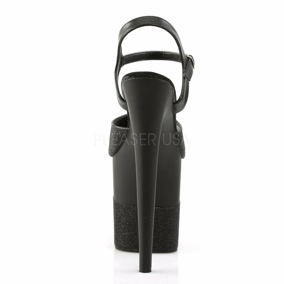 8″ (20.3cm) stiletto heel, 4″ (10.2cm) platform ankle strap sandal featuring glittered top and half platform.