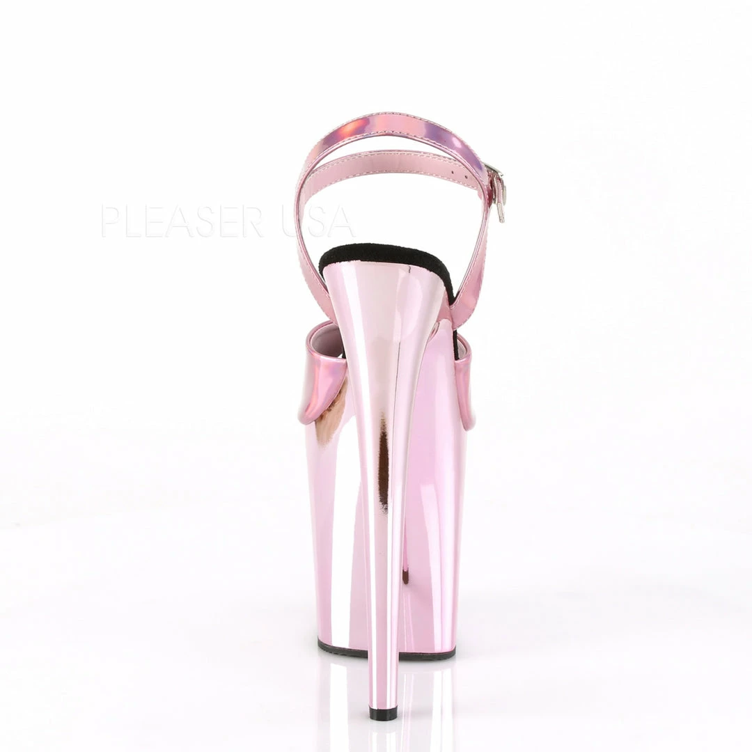 8″ (20.3cm) stiletto heel, 4″ (10.2cm) platform ankle strap sandal with chrome plated platform.