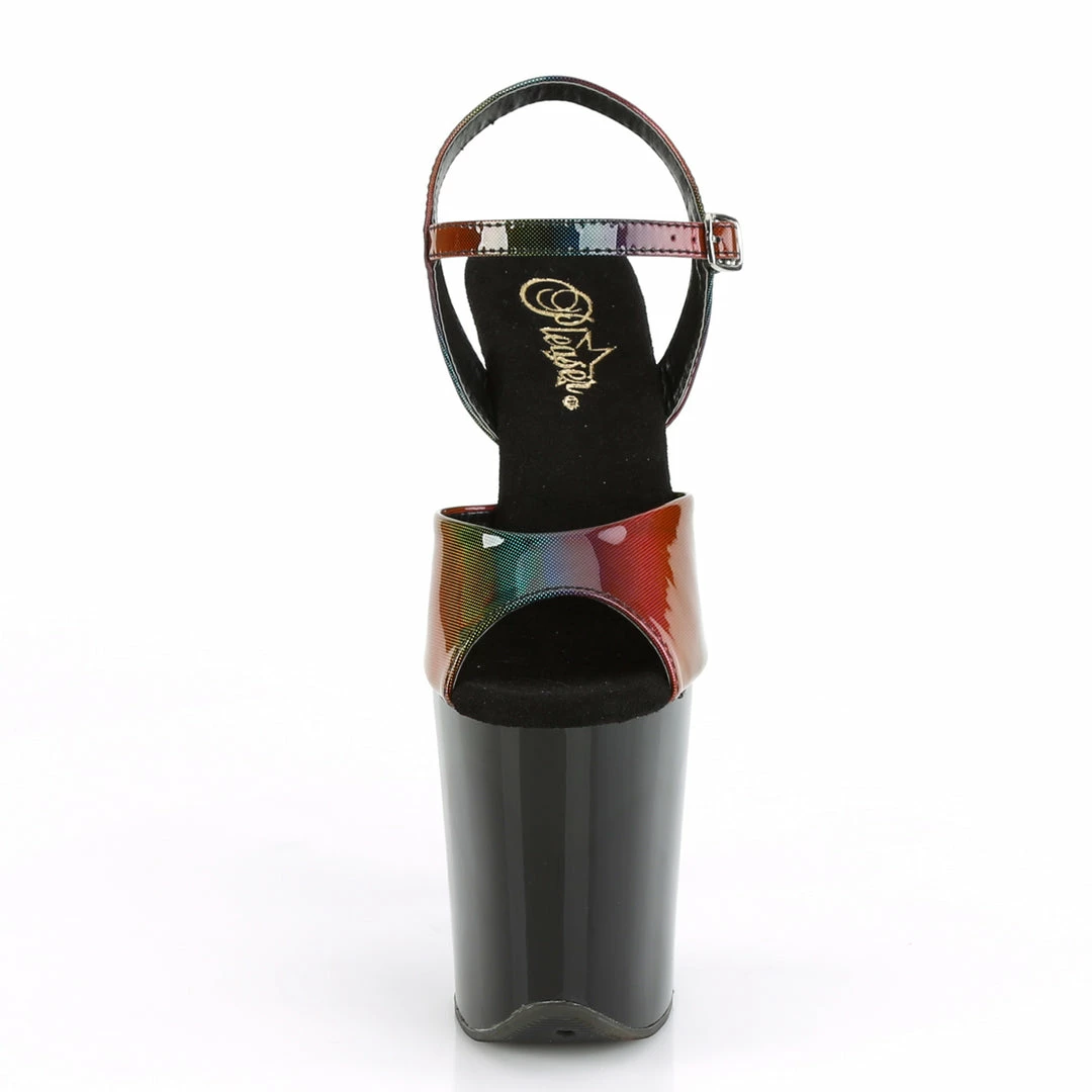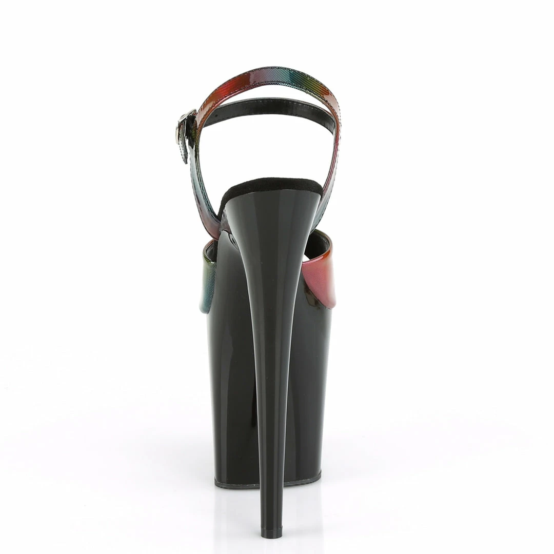 8″ (20cm) heel, 4″ (10cm)Β platform ankle strap sandal.
