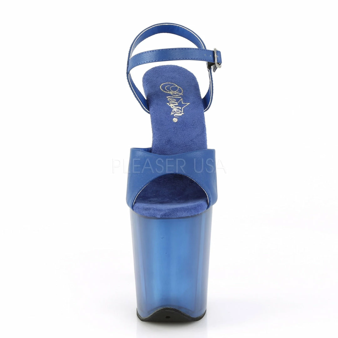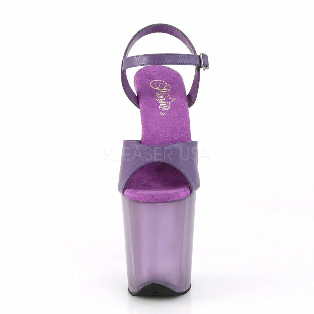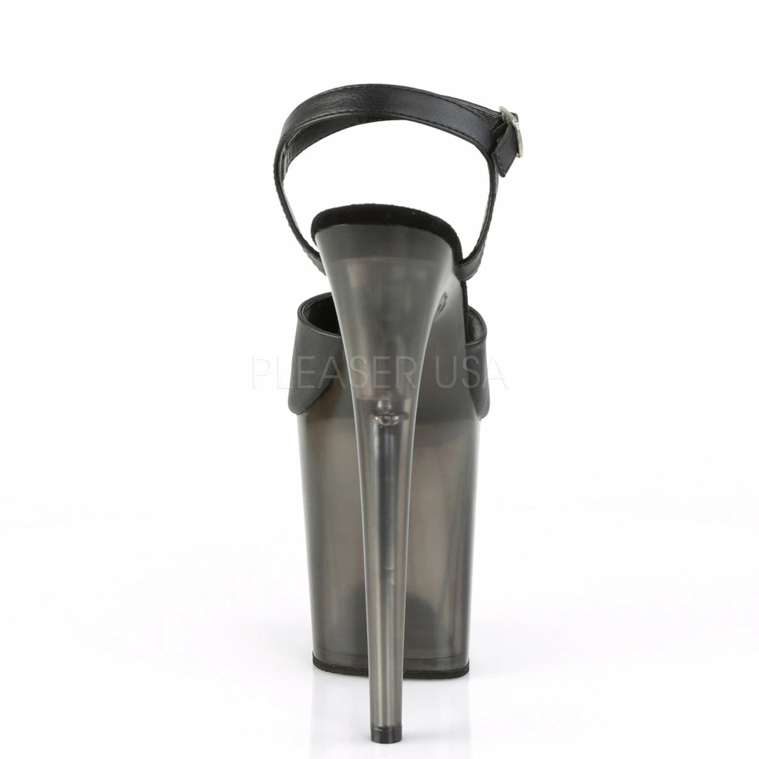 8″ (20.3cm) stiletto heel, 4″ (10.2cm)Β frosted platformΒ ankle strap sandal.