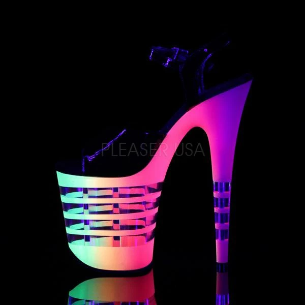 8″ (20.3cm) stiletto heel, 4″ (10.2cm) platform ankle strap sandal featuring neon UV reactive lines.