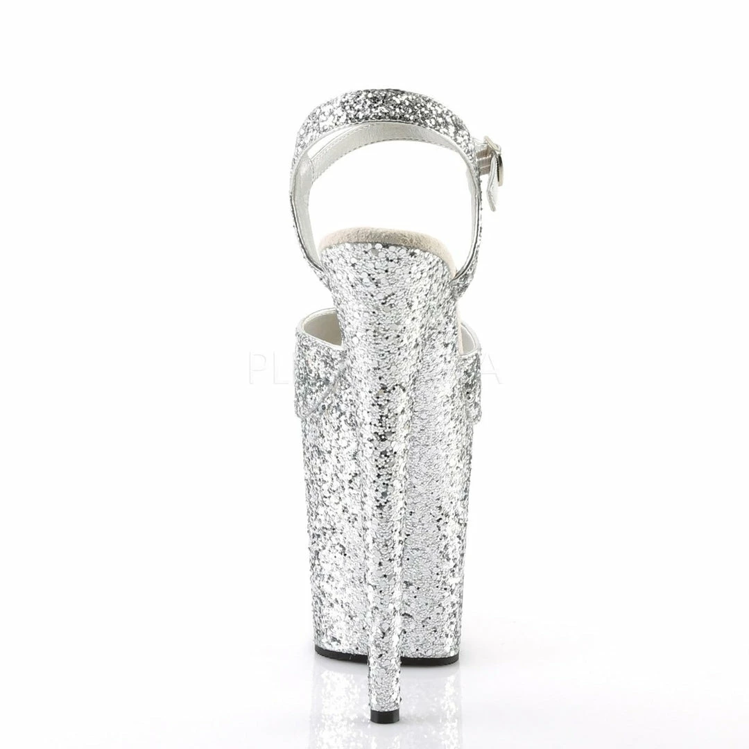 8″ (20.3cm) stiletto heel, 4″ (10.2cm)Β platformΒ glitter ankle strap sandal.