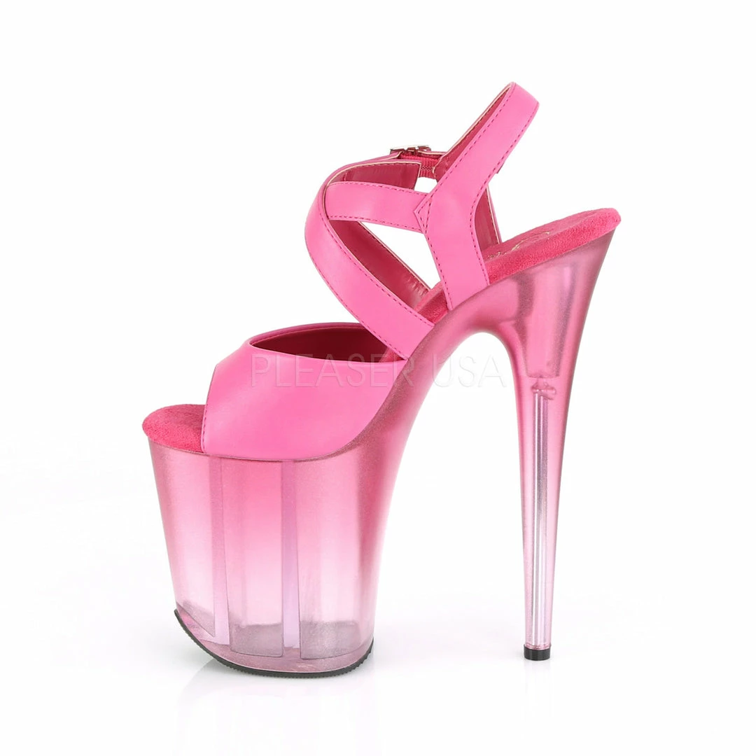 8″ (20cm) stiletto heel, 4″ (10cm)Β platformΒ criss-cross ankle strap sandal with tinted/ombre/faded platform bottom.