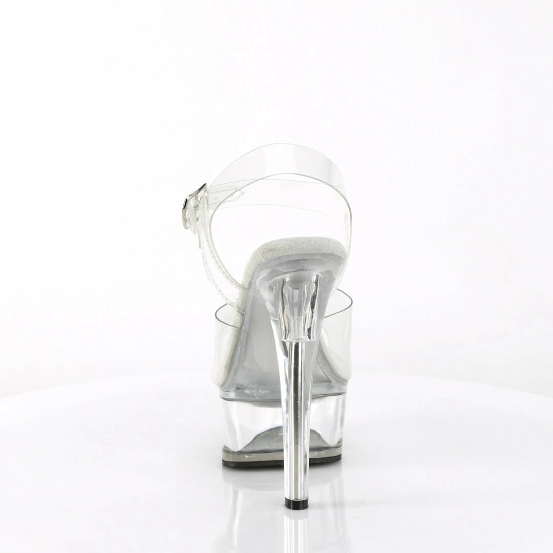 6″ (15.2cm) heel, 1/3/4″ (4.4cm) platform comfort width ankle strap sandal.